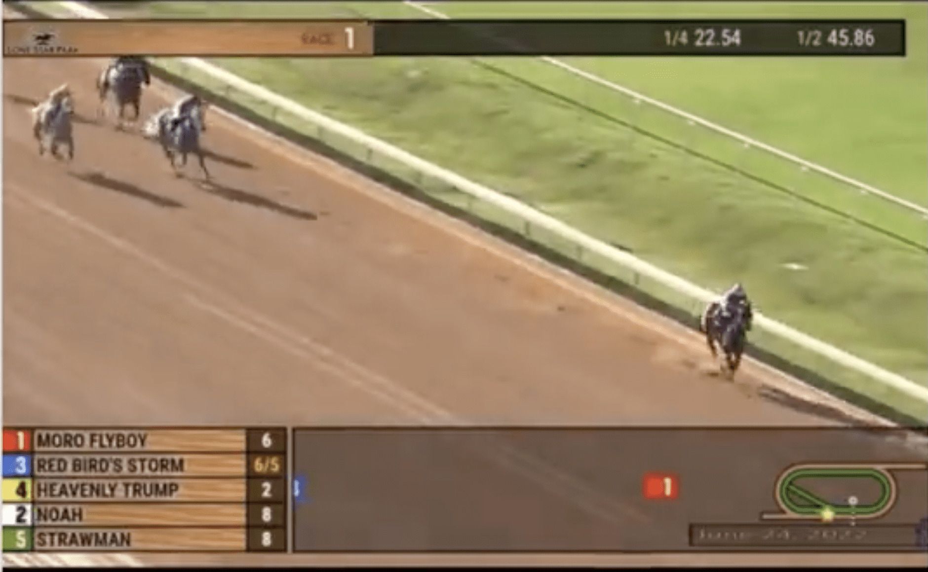 LSP in Grand Prairie, Texas, hosted a horse race for three-year-olds and up, and for most of the maiden race a four-year-old gelding named Moro Flyboy had a clear lead ahead of the rest of the competition, including a horse named “Heavenly Trump.”