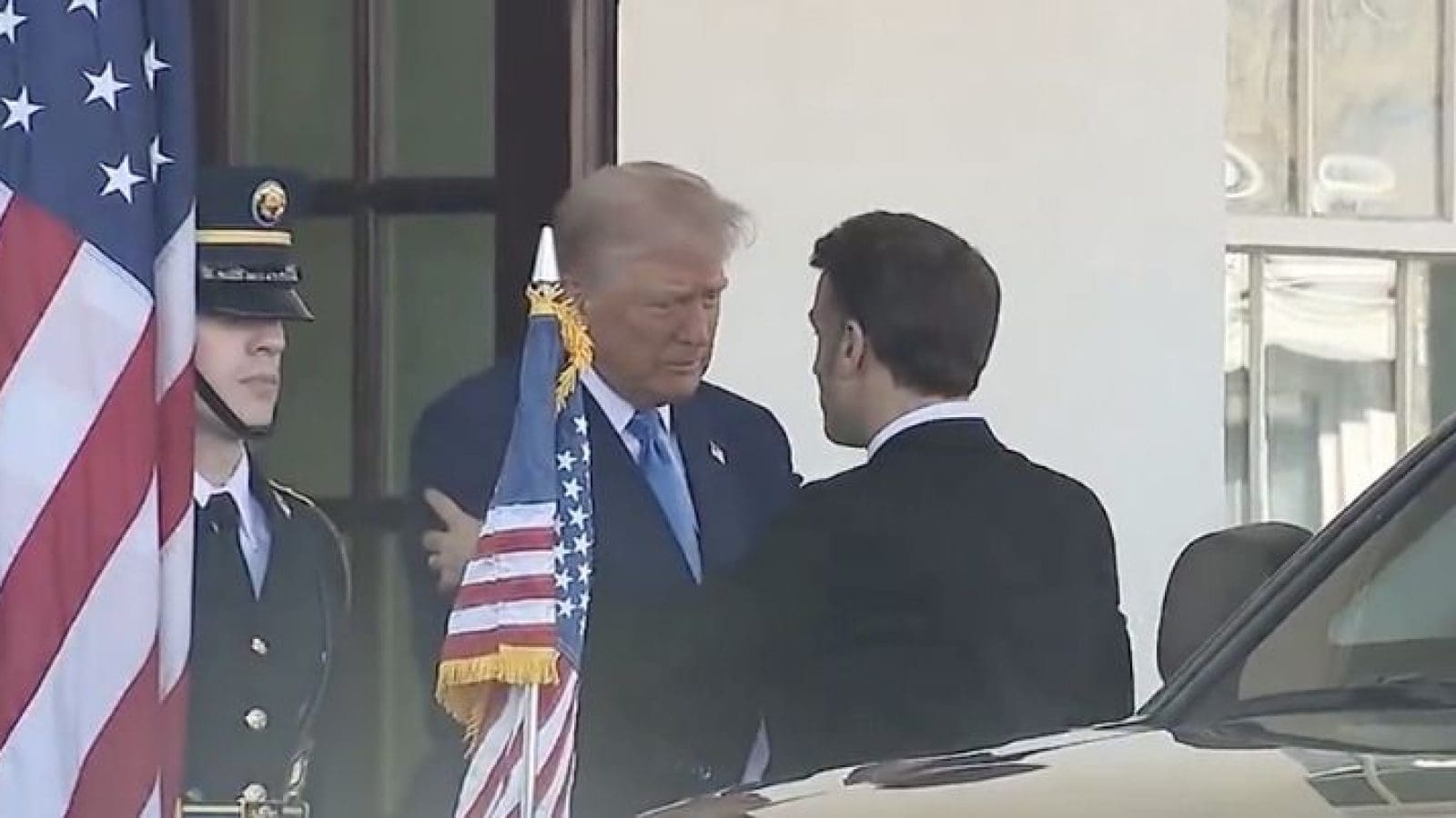 President Trump and French President Emmanuel Macron engaged in a tug-of-war handshake outside the White House on Monday.