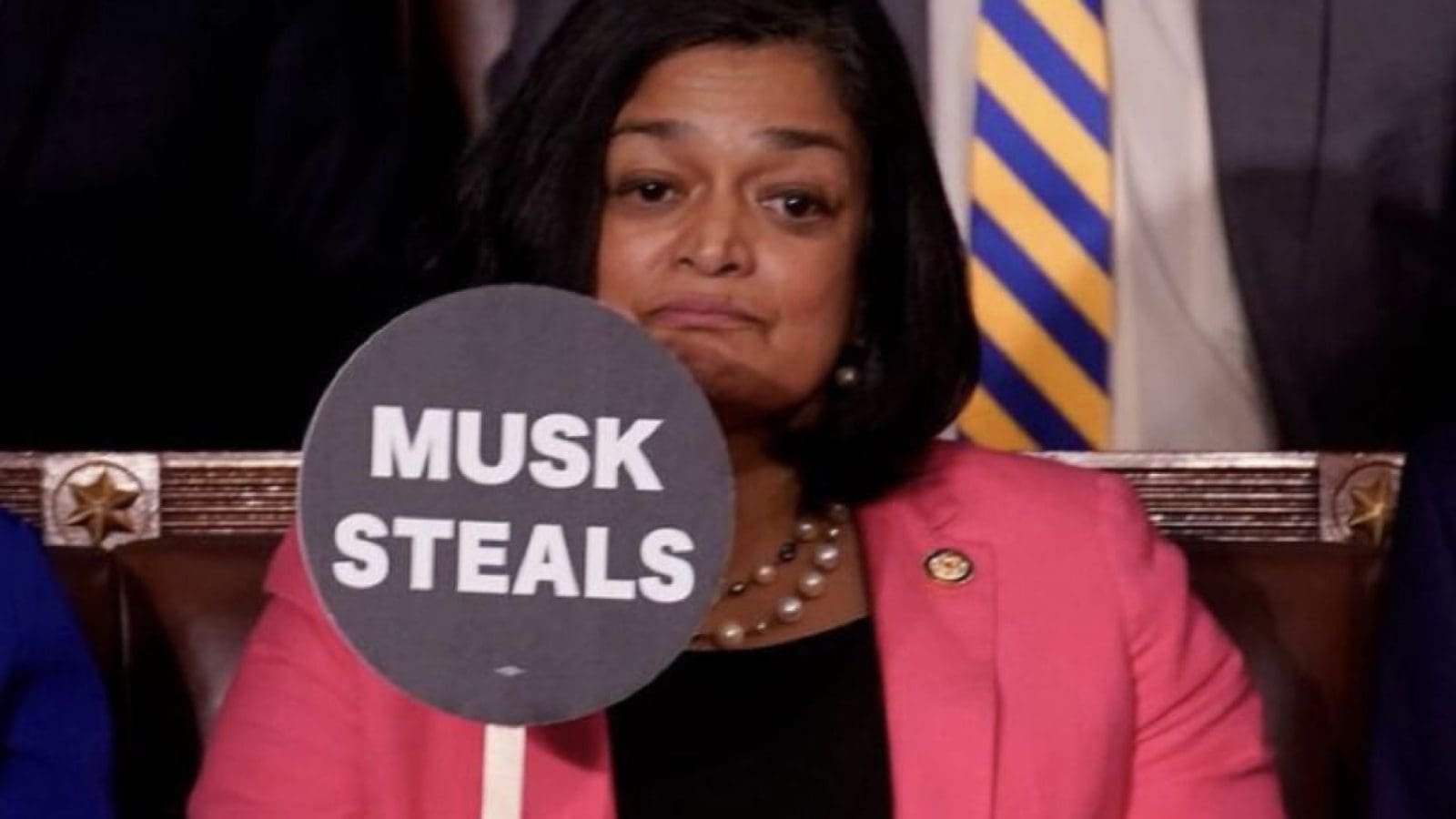 Several dozen House Democrats are holding up small circular signs during the joint address in protest, reading “Musk Steals,” “Save Medicaid” and “Protect Veterans.”