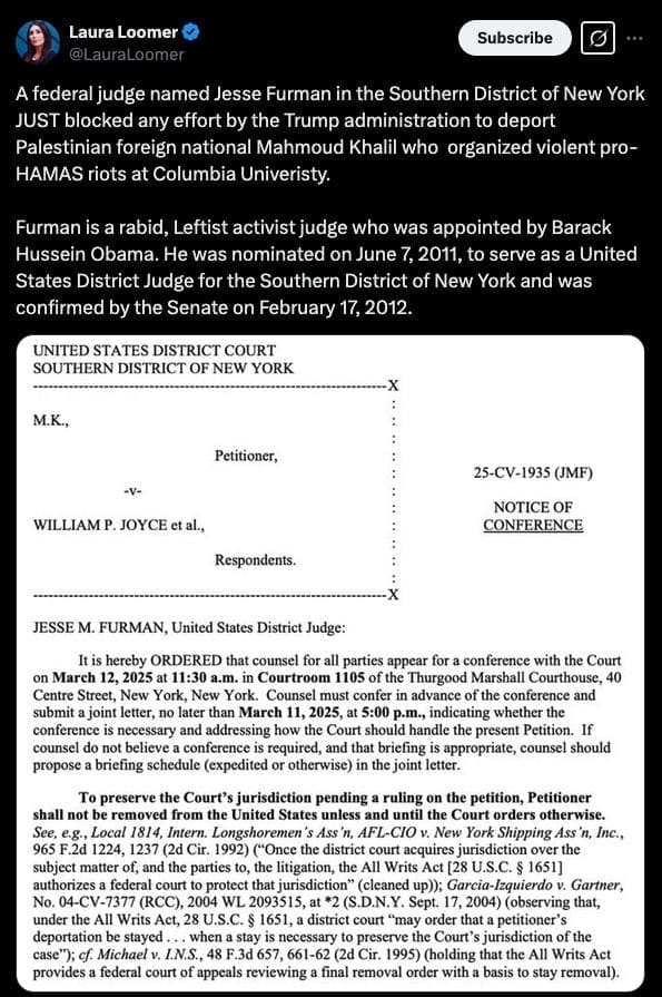 Judge Jesse M. Furman, an Obama appointee, ruled that Khalil may not be deported “unless and until the Court orders otherwise.”