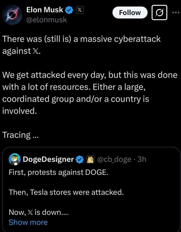 “There was (still is) a massive cyberattack against 𝕏,” Musk said.