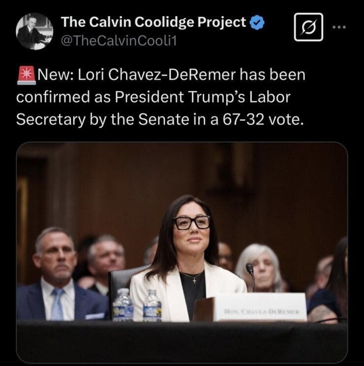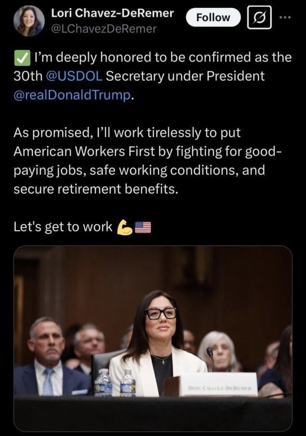 “I’m deeply honored to be confirmed as the 30th @USDOL Secretary under President @realDonaldTrump. As promised, I’ll work tirelessly to put American Workers First by fighting for good-paying jobs, safe working conditions, and secure retirement benefits,” Chavez-DeRemer said.