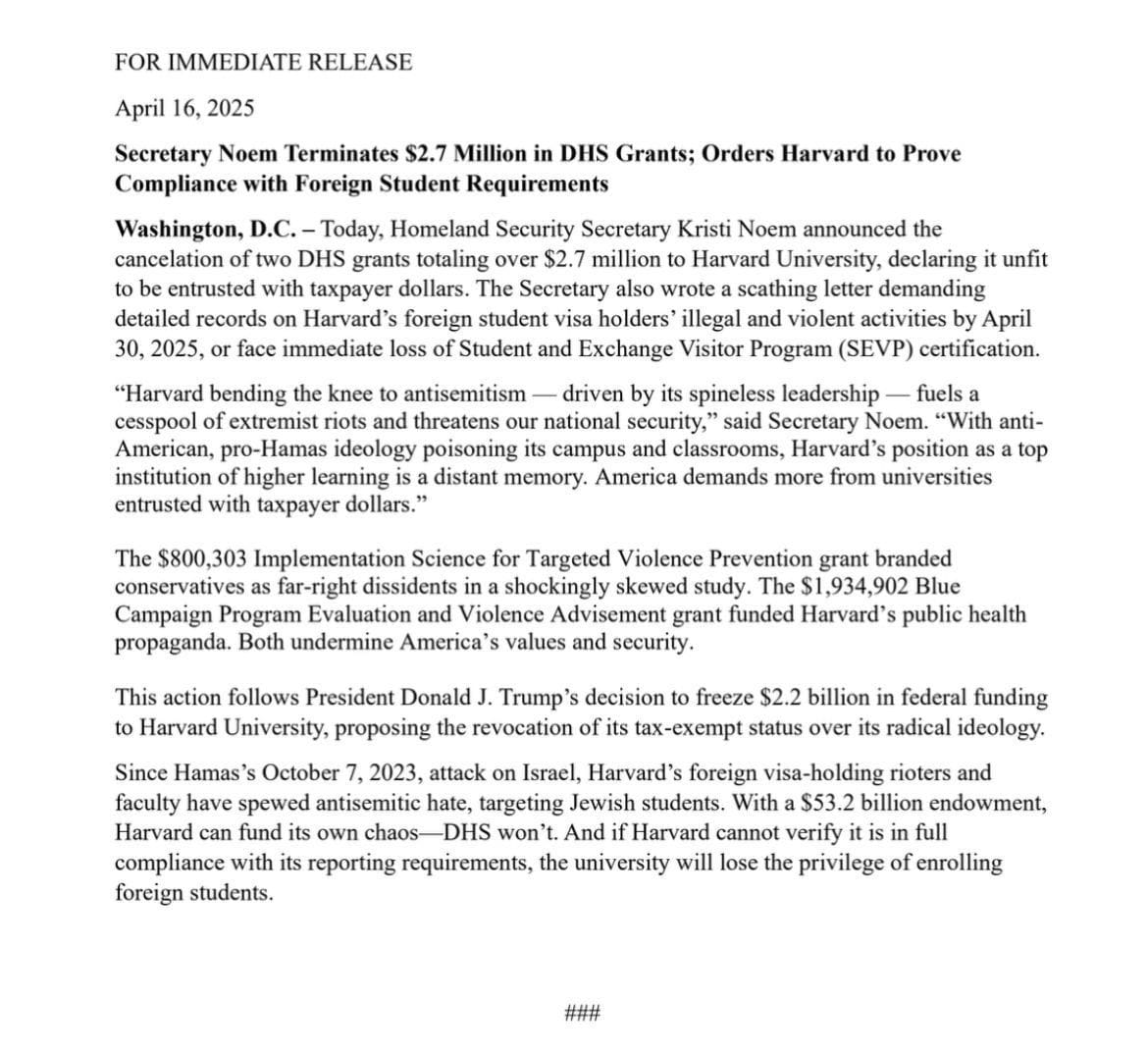 Today, Department of Homeland Security Secretary Kristi Noem announced the cancelation of two DHS grants totaling over $2.7 million to Harvard University, declaring it unfit to be entrusted with taxpayer dollars. The Secretary also wrote a scathing letter demanding detailed records on Harvard’s foreign student visa holders’ illegal and violent activities by April 30, 2025, or face immediate loss of Student and Exchange Visitor Program (SEVP) certification.