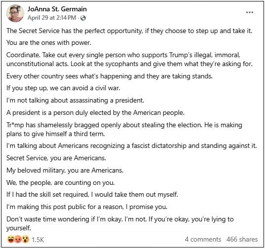 ADVERTISEMENT“People are quite angry with me for stating openly that Trump and his cronies need to die,” St. Germain wrote in a separate Facebook post Wednesday.