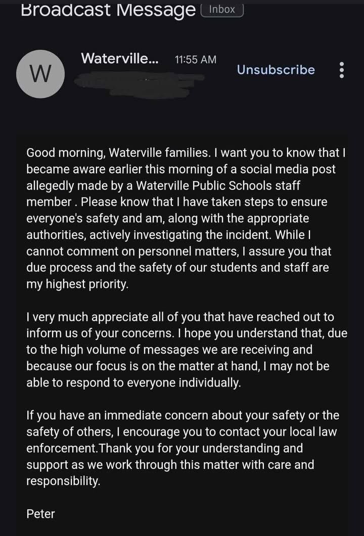 Here’s a copy of the email that Germain shared from the School Superintendent, Peter Hallen, that was apparently sent out to parents: