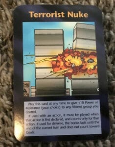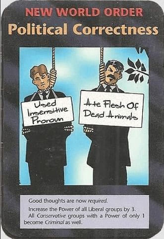 And so here’s a card from Illuminati “game”, over 20 years prior! It shows someone getting executed for the CRIME of using the wrong pronoun. “Used Insensitive Pronoun”