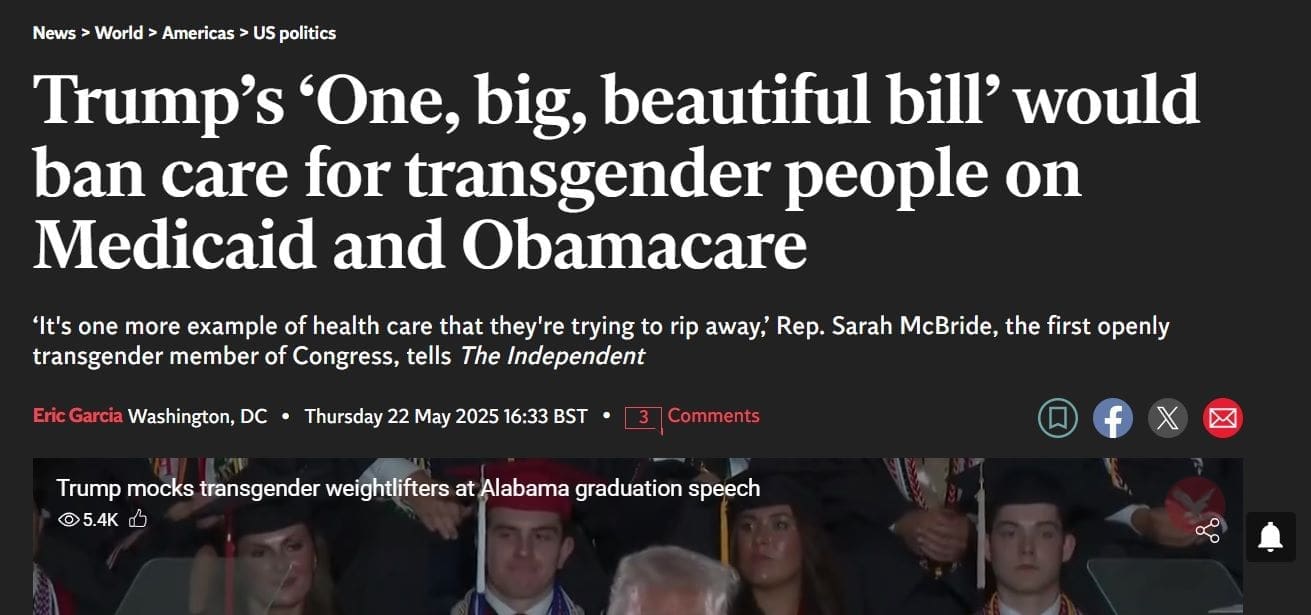 After all, how will all his buddies and his ‘wife’ get their taxpayer funded MUTILATIONS… if President Trump’s ‘Big Beautiful Bill’ REMOVES THAT COVERAGE from Medicaid as it is now stipulated under the Affordable Care Act?
