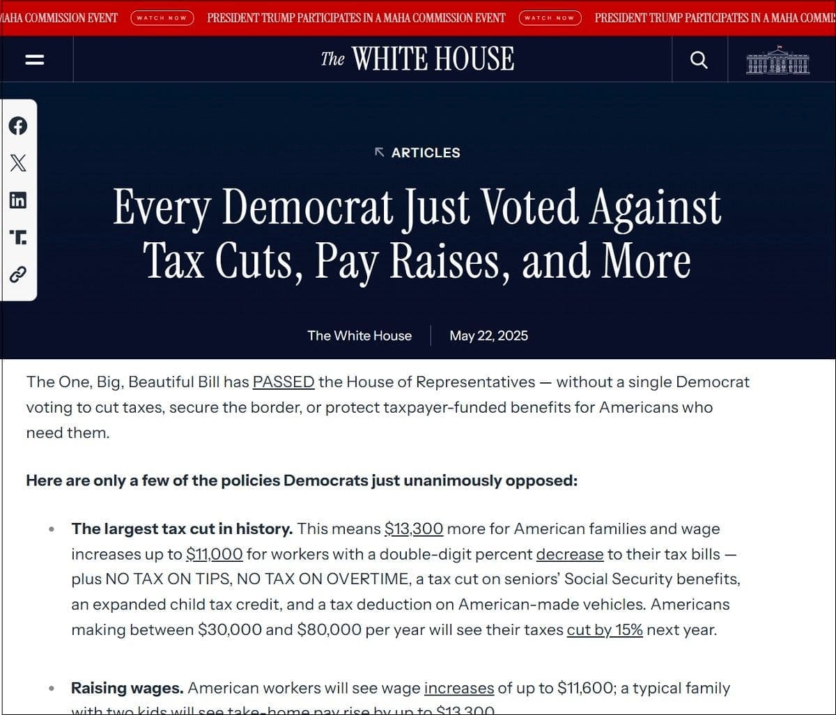 The One, Big, Beautiful Bill has PASSED the House of Representatives — without a single Democrat voting to cut taxes, secure the border, or protect taxpayer-funded benefits for Americans who need them.
