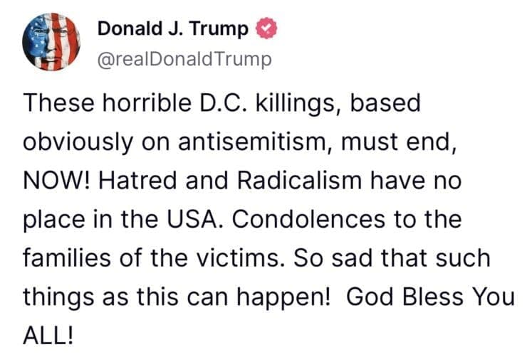 "These horrible D.C. killings, based obviously on antisemitism, must end, NOW! Hatred and Radicalism have no place in the USA. Condolences to the families of the victims. So sad that such things as this can happen! God Bless You ALL!" President Trump said.