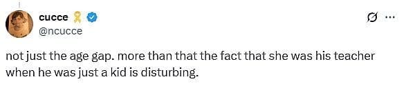 ADVERTISEMENT‘Not just the age gap. More than that the fact that she was his teacher when he was just a kid is disturbing,’ declared another.