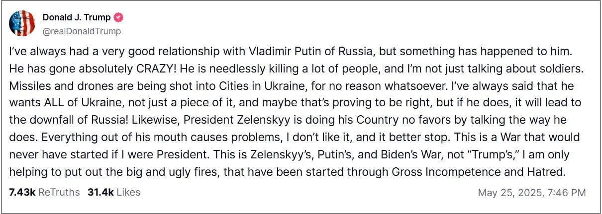 I’ve always had a very good relationship with Vladimir Putin of Russia, but something has happened to him. He has gone absolutely CRAZY! He is needlessly killing a lot of people, and I’m not just talking about soldiers. Missiles and drones are being shot into Cities in Ukraine, for no reason whatsoever. I’ve always said that he wants ALL of Ukraine, not just a piece of it, and maybe that’s proving to be right, but if he does, it will lead to the downfall of Russia! Likewise, President Zelenskyy is doing his Country no favors by talking the way he does. Everything out of his mouth causes problems, I don’t like it, and it better stop. This is a War that would never have started if I were President. This is Zelenskyy’s, Putin’s, and Biden’s War, not “Trump’s,” I am only helping to put out the big and ugly fires, that have been started through Gross Incompetence and Hatred.