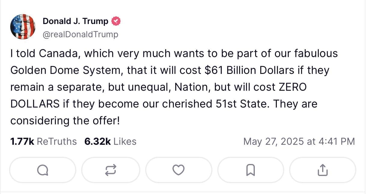 It seems as though President Trump was wise once again, because according to a new post on TruthSocial President Trump just revealed that Canada is indeed considering the offer now and it all is due to the new Golden Dome.