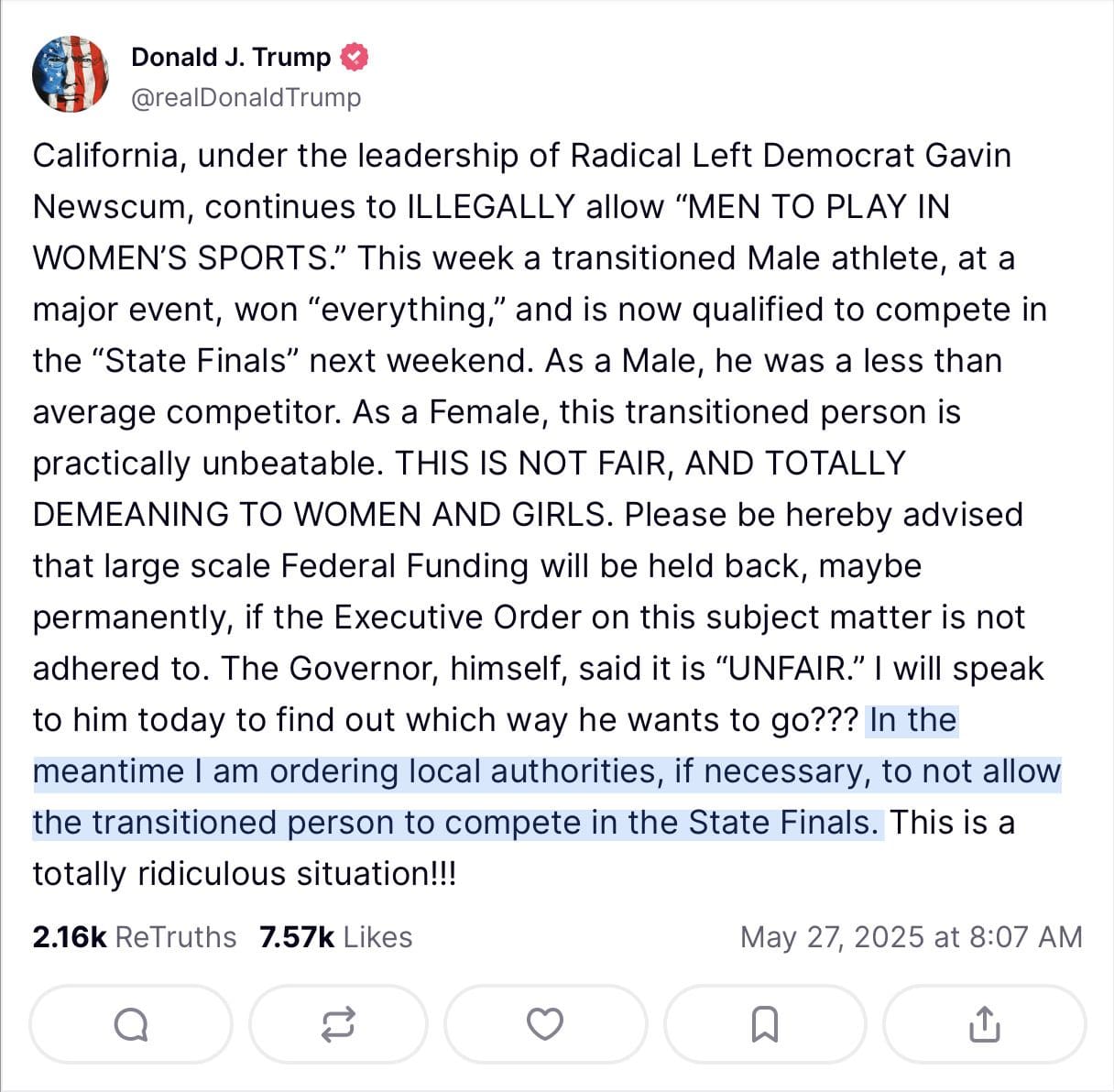 Trump on men in women’s sports in California, says he will withhold federal funds if Gavin Newsom allows a male competitor to compete as a woman. pic.twitter.com/C0dgmSsmw6