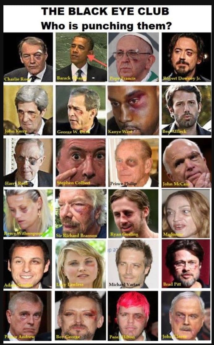 4)There are numerous politicians and celebrities who have had a (left) black eye. Remember, this is about Royal Authority. #Qanon pic.twitter.com/pg92vmQ1l4
