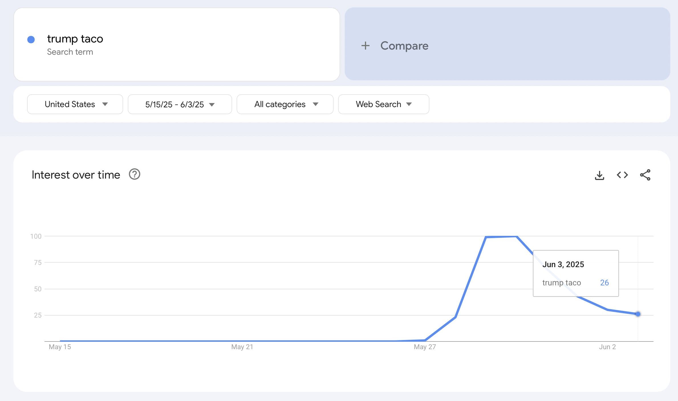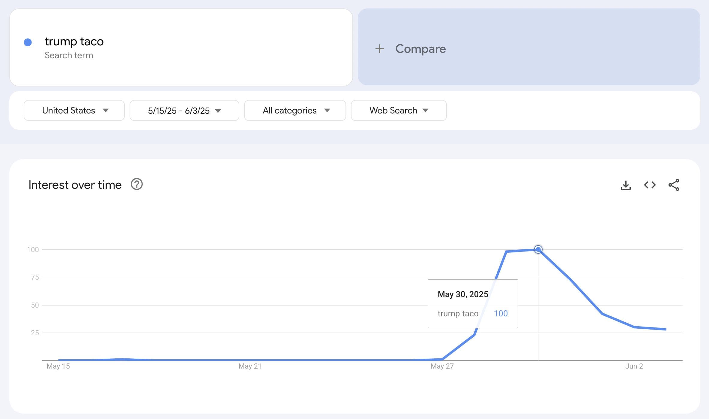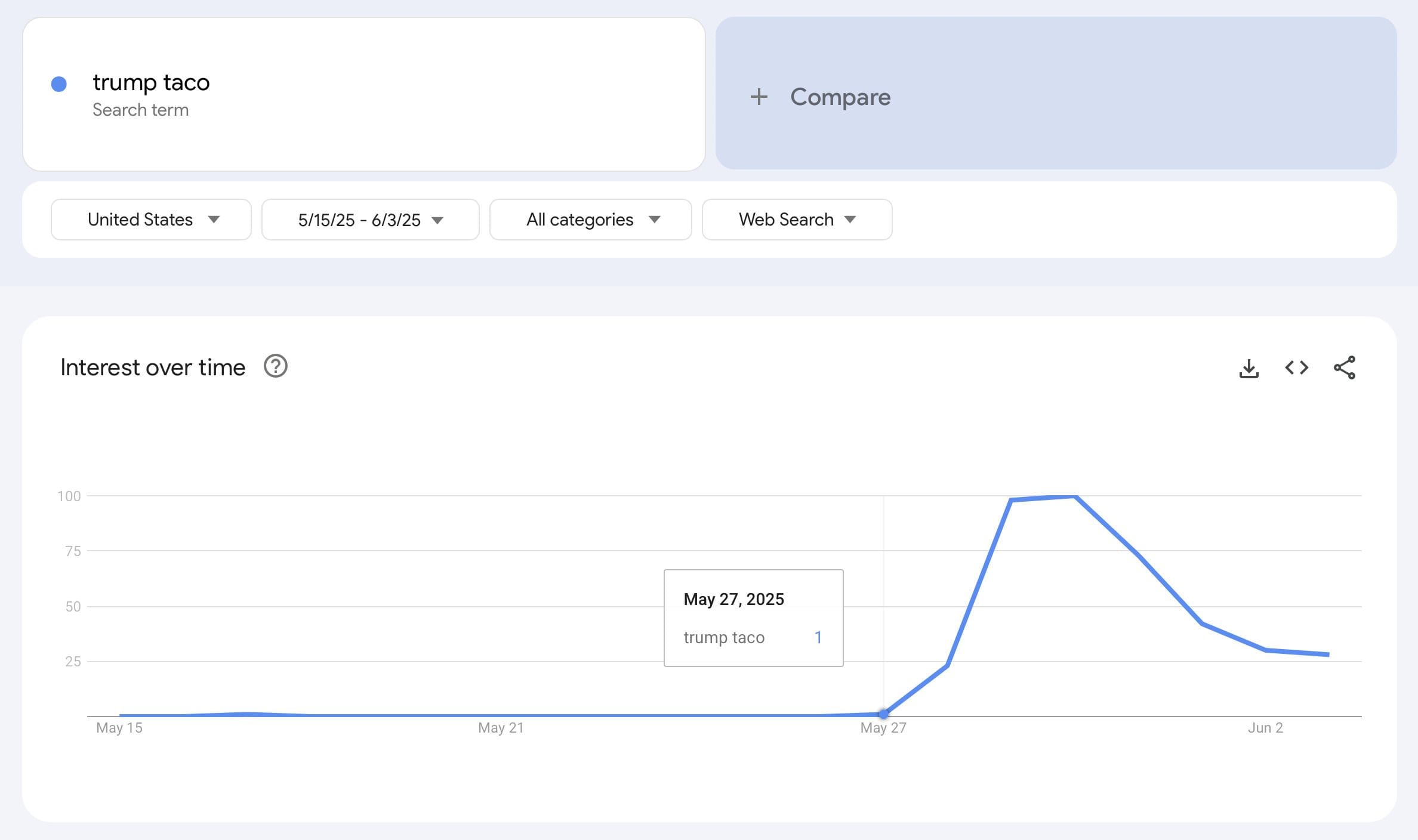 On May 27, 2025, before the Democrats spent $20 million to try and push this dorky campaign, no one in the world was searching for "Trump Taco" because it's stupid, it's not a thing, it doesn't exist.