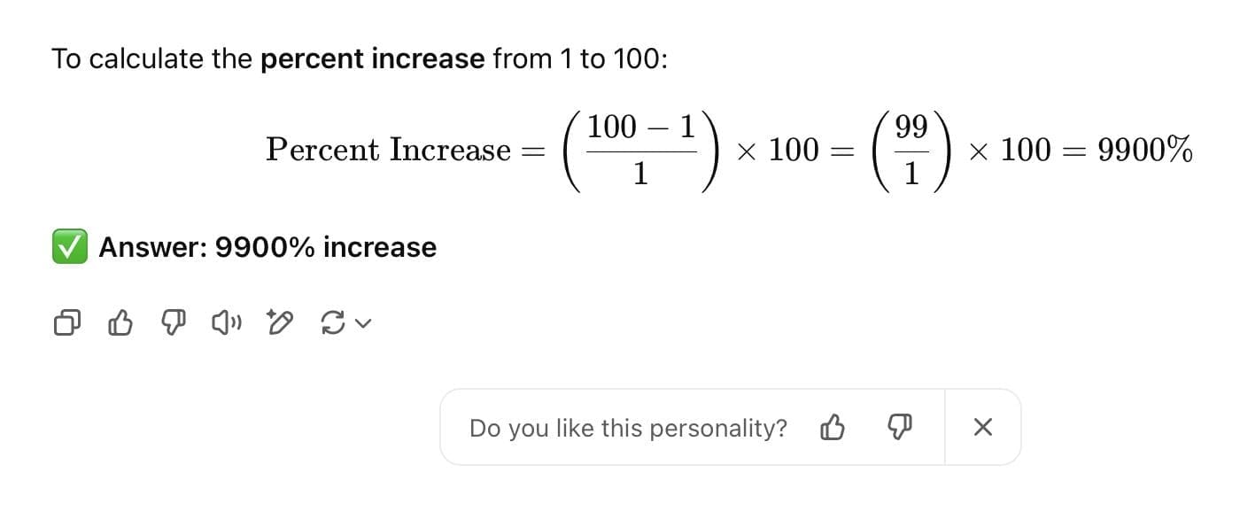 Going from 1 to 100 get's you, drumroll please..... a 9900% increase!