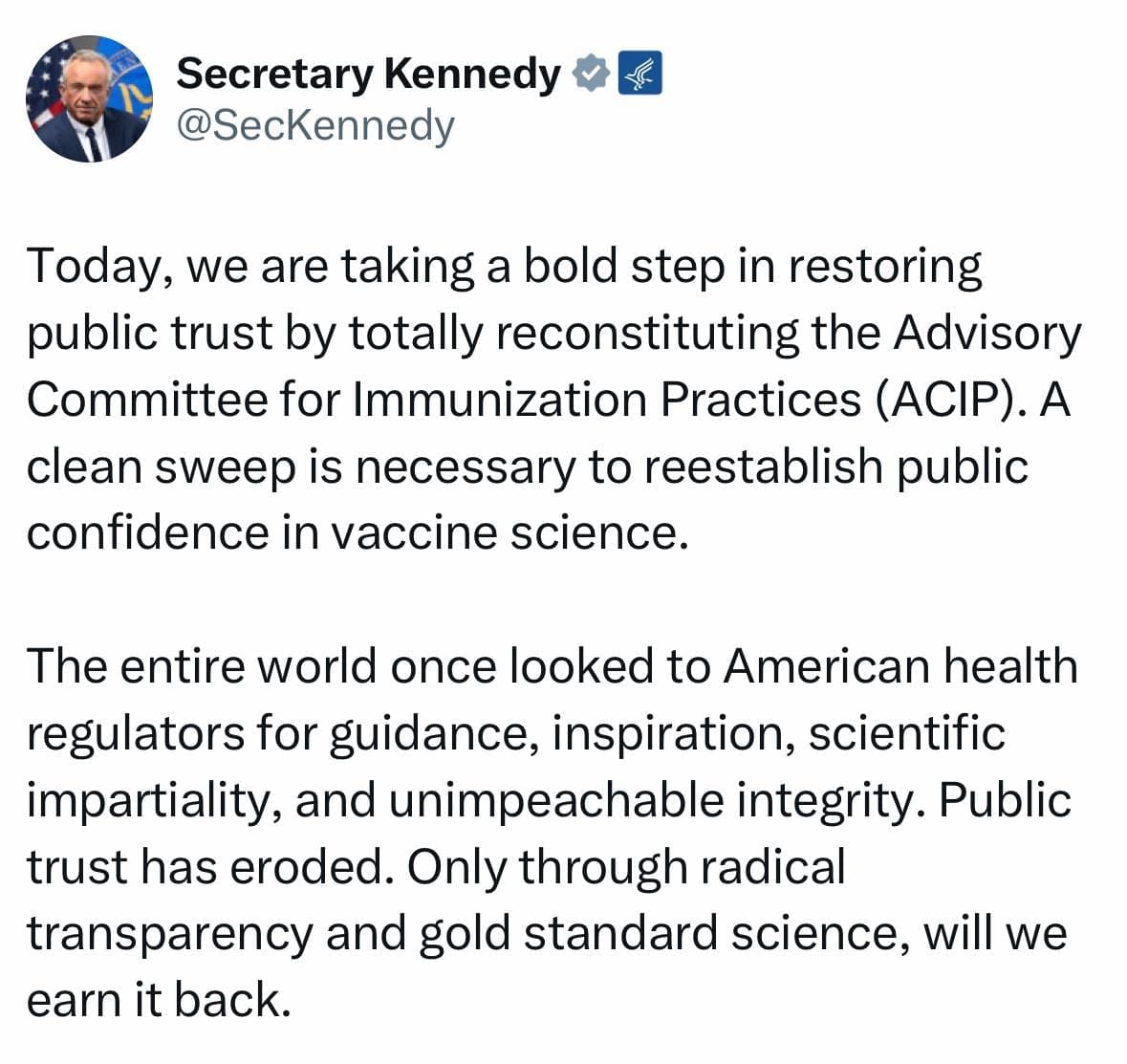 🚨 BREAKING: HHS Secretary RFK Jr. has fired all 17 members of the CDC’s ACIP vaccine advisory panel, the committee that helps shape U.S. vaccine policy