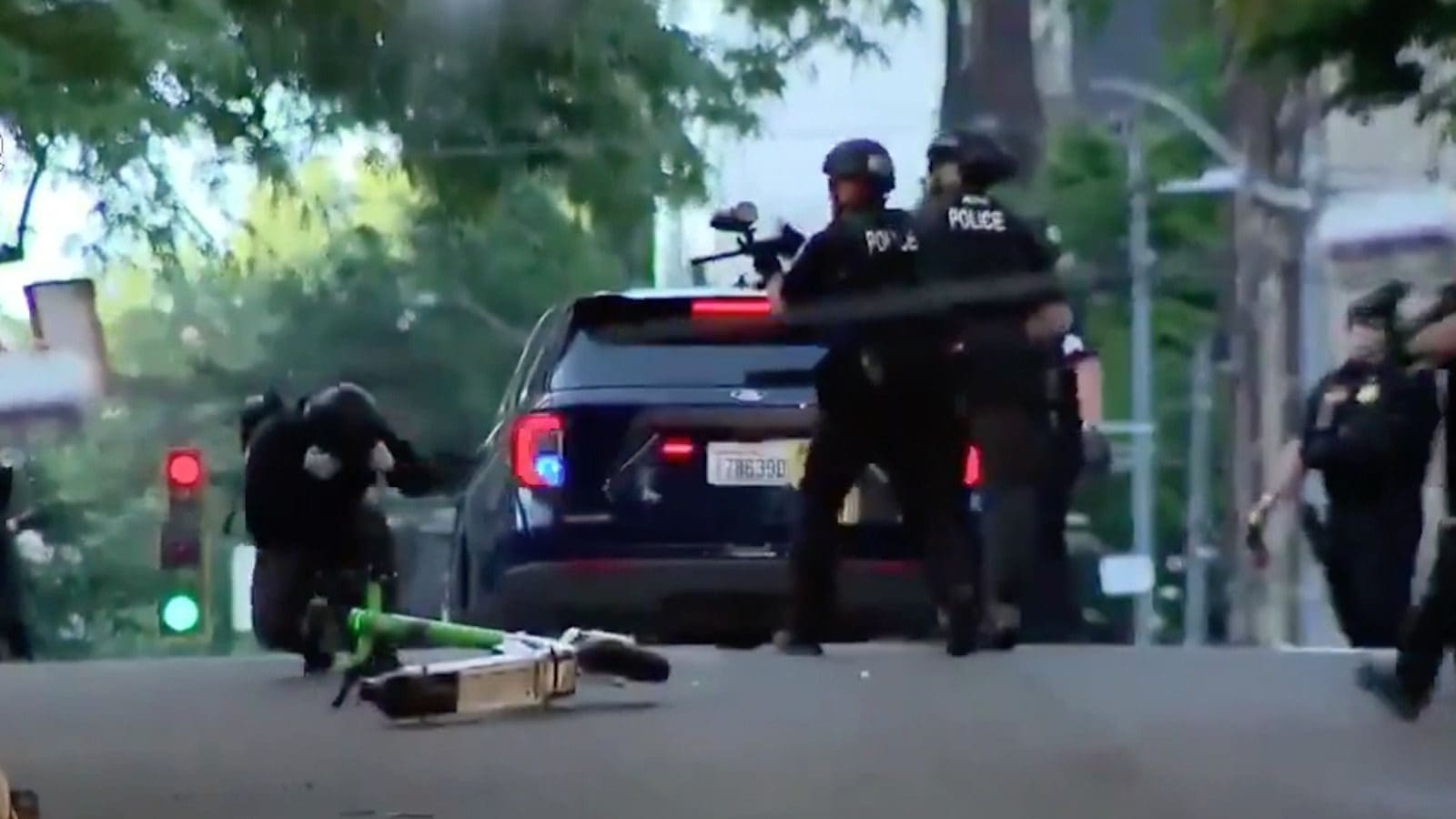 Some members of the crowd vandalized patrol cars and others faced off with cops, as a motorist plowed through the mob of demonstrators after ignoring police orders to stop, according to Fox News. No injuries were reported in the frightening incident.