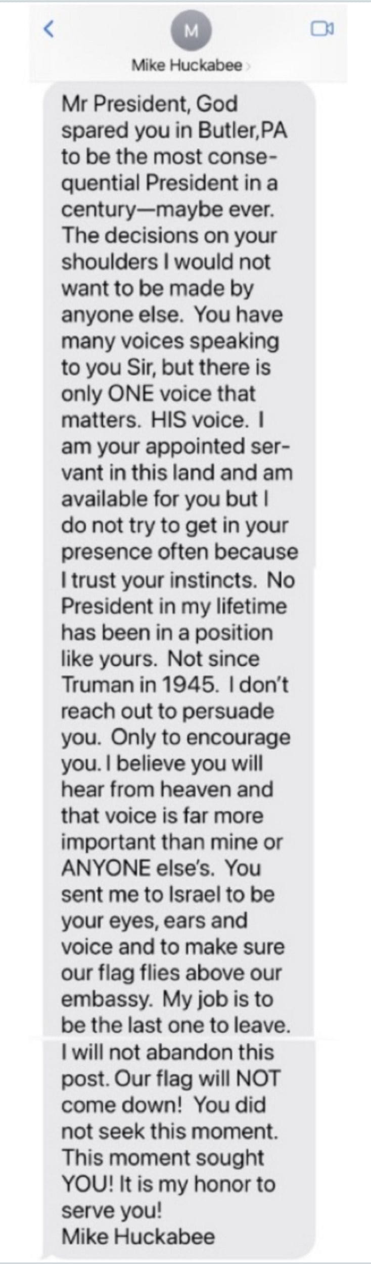 President Trump just shared a TRUTH post featuring a powerful message he received from U.S. Ambassador to Israel—the GREAT Mike Huckabee. pic.twitter.com/FKhhY8fGHB