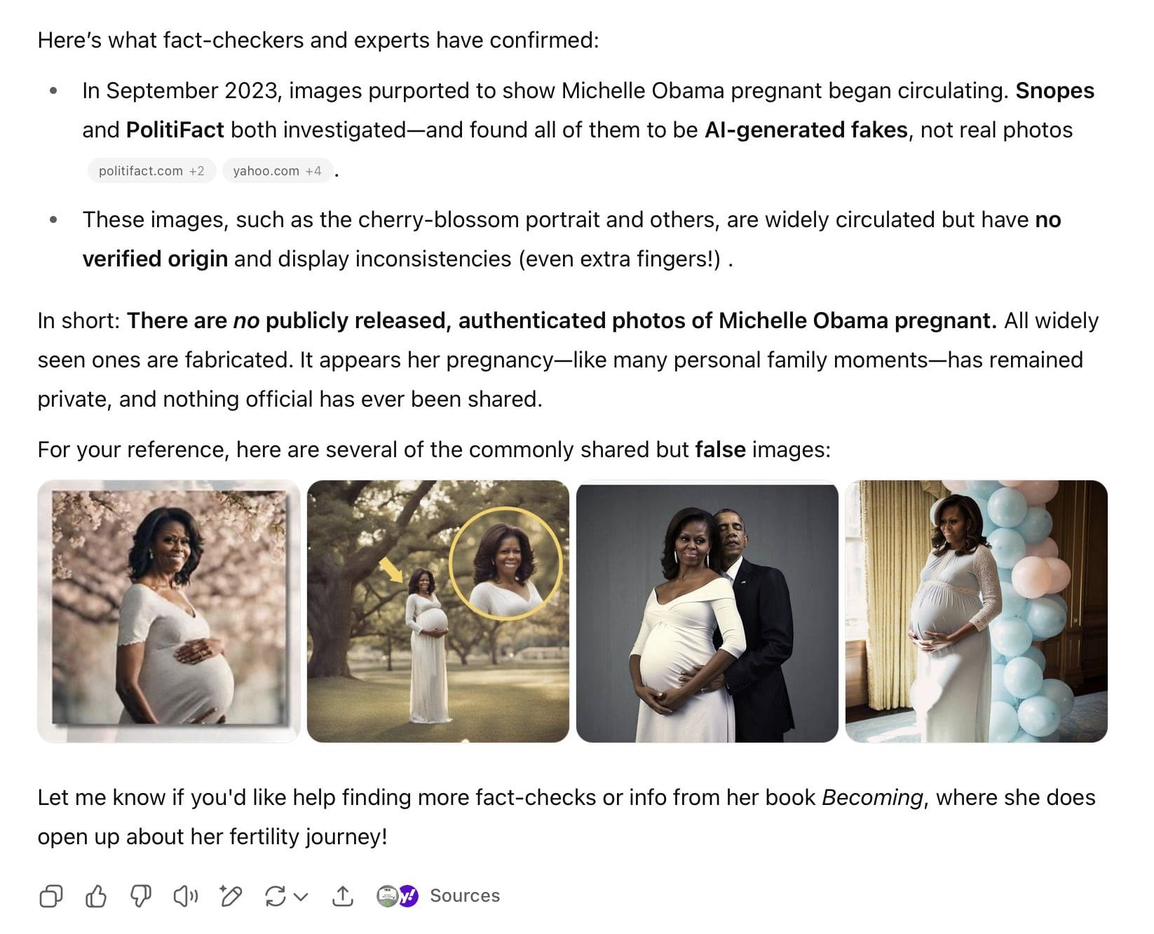 In late September 2023, pictures allegedly depicting Michelle Obama during her pregnancy were circulated on social media. One X, formerly known as Twitter, user captioned them "Michelle Obama silences ALL conspiracy theorists and demands a universal apology after FINALLY releasing glowing pregnancy photos when she was expecting Sasha and Malia."