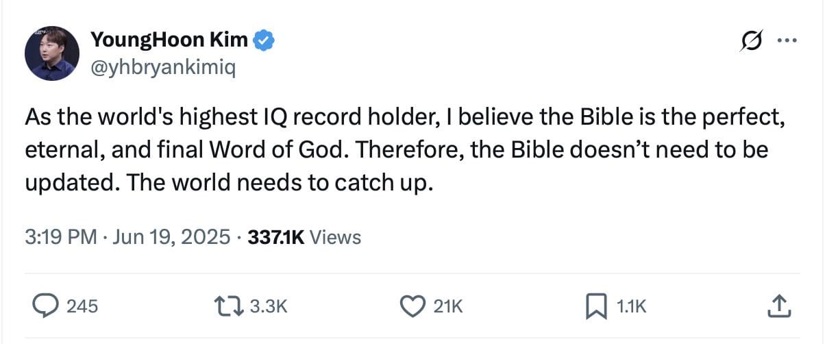 🔥🚨BREAKING: Younghoon Kim, the man with the reported highest IQ in the world announced that “Jesus Christ is God, the way and the truth and the life.” pic.twitter.com/7GPcnHEsdN
