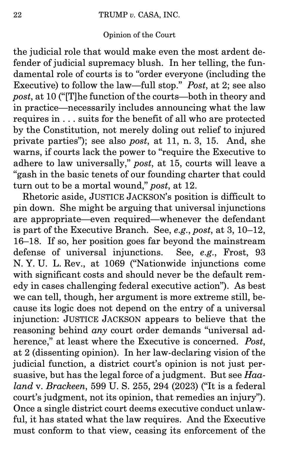 As best we can tell, though, her argument is more extreme still, because its logic does not depend on the entry of a universal injunction: JUSTICE JACKSON appears to believe that the reasoning behind any court order demands “universal adherence,” at least where the Executive is concerned. Post, at 2 (dissenting opinion). In her law-declaring vision of the judicial function, a district court’s opinion is not just persuasive, but has the legal force of a judgment. But see Haaland v. Brackeen, 599 U. S. 255, 294 (2023) (“It is a federal court’s judgment, not its opinion, that remedies an injury”).