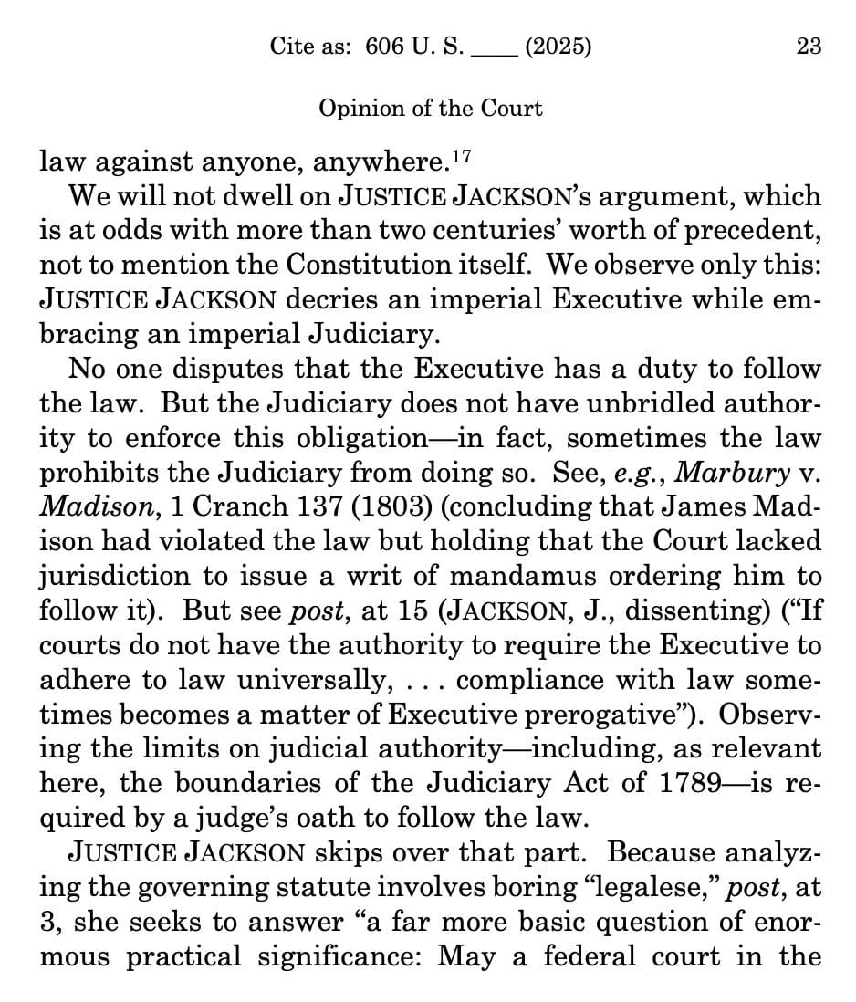 No one disputes that the Executive has a duty to follow the law. But the Judiciary does not have unbridled authority to enforce this obligation—in fact, sometimes the law prohibits the Judiciary from doing so. See, e.g., Marbury v. Madison, 1 Cranch 137 (1803) (concluding that James Madison had violated the law but holding that the Court lacked jurisdiction to issue a writ of mandamus ordering him to follow it). But see post, at 15 (JACKSON, J., dissenting) (“If courts do not have the authority to require the Executive to adhere to law universally, . . . compliance with law sometimes becomes a matter of Executive prerogative”). [Citing Marbury v. Madison is pretty hilarious, one of the most basic and oldest cases in all of Constitutional law — citing this implies Jackson doesn’t even know the most basic of the basics.]