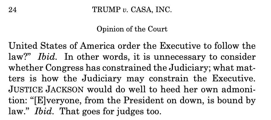 JUSTICE JACKSON would do well to heed her own admonition: “[E]veryone, from the President on down, is bound by law.” Ibid. That goes for judges too.