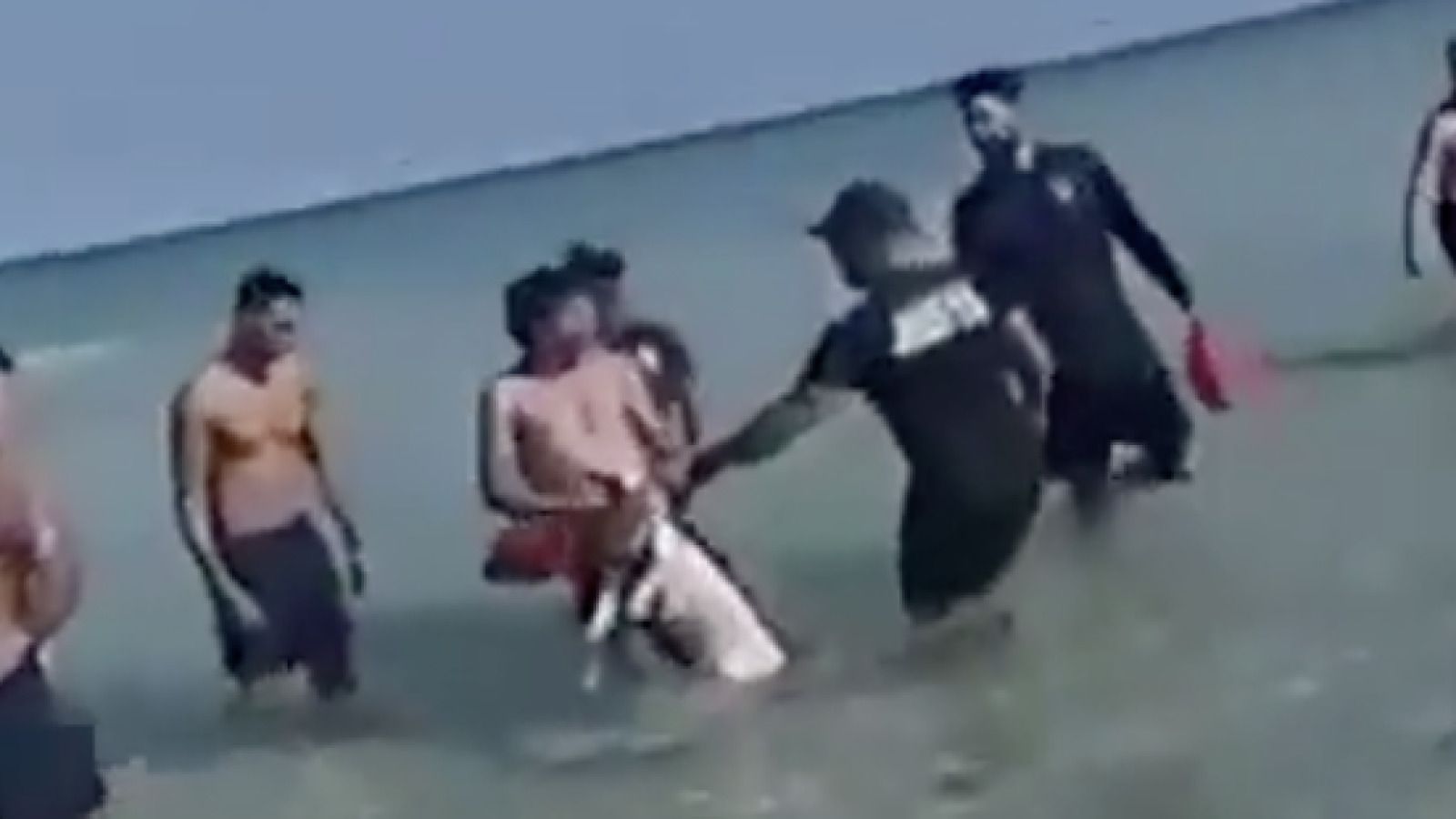In the video, the man can be seen forcibly dragging his dog into the ocean by its collar, but is stopped as rescue officers arrive.