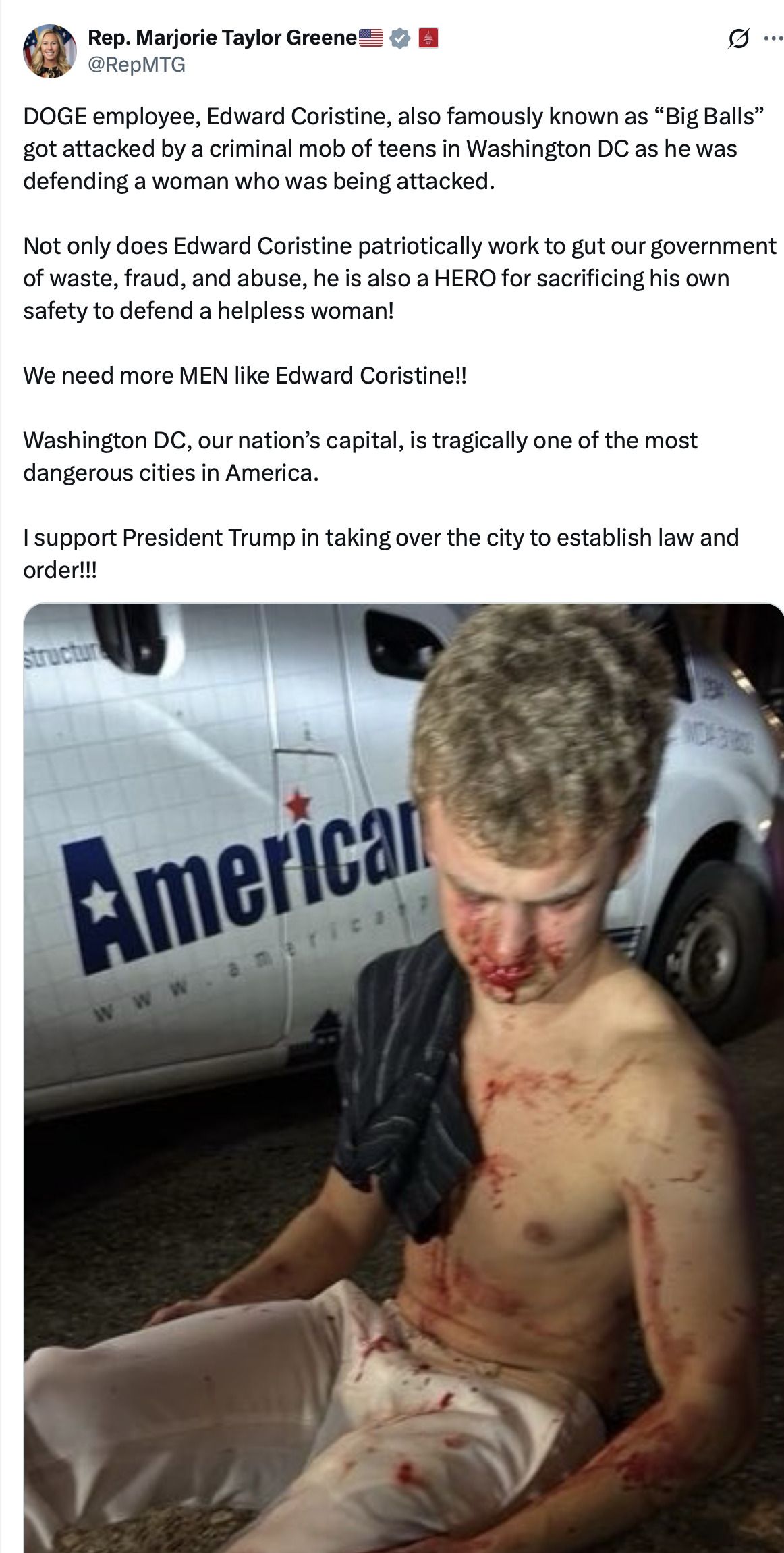 Former DOGE head Elon Musk weighed in on X, sharing more of the story.“A few days ago, a gang of about a dozen young men tried to assault a woman in her car at night in DC,” Musk wrote. “A @Doge team member saw what was happening, ran to defend her and was severely beaten to the point of concussion, but he saved her. It is time to federalize DC.”