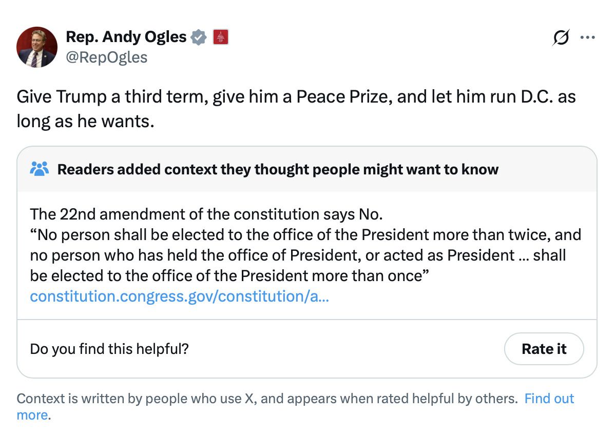 You will of course see that Twitter/X added a Community Note saying the 22nd Amendment prohibits this.