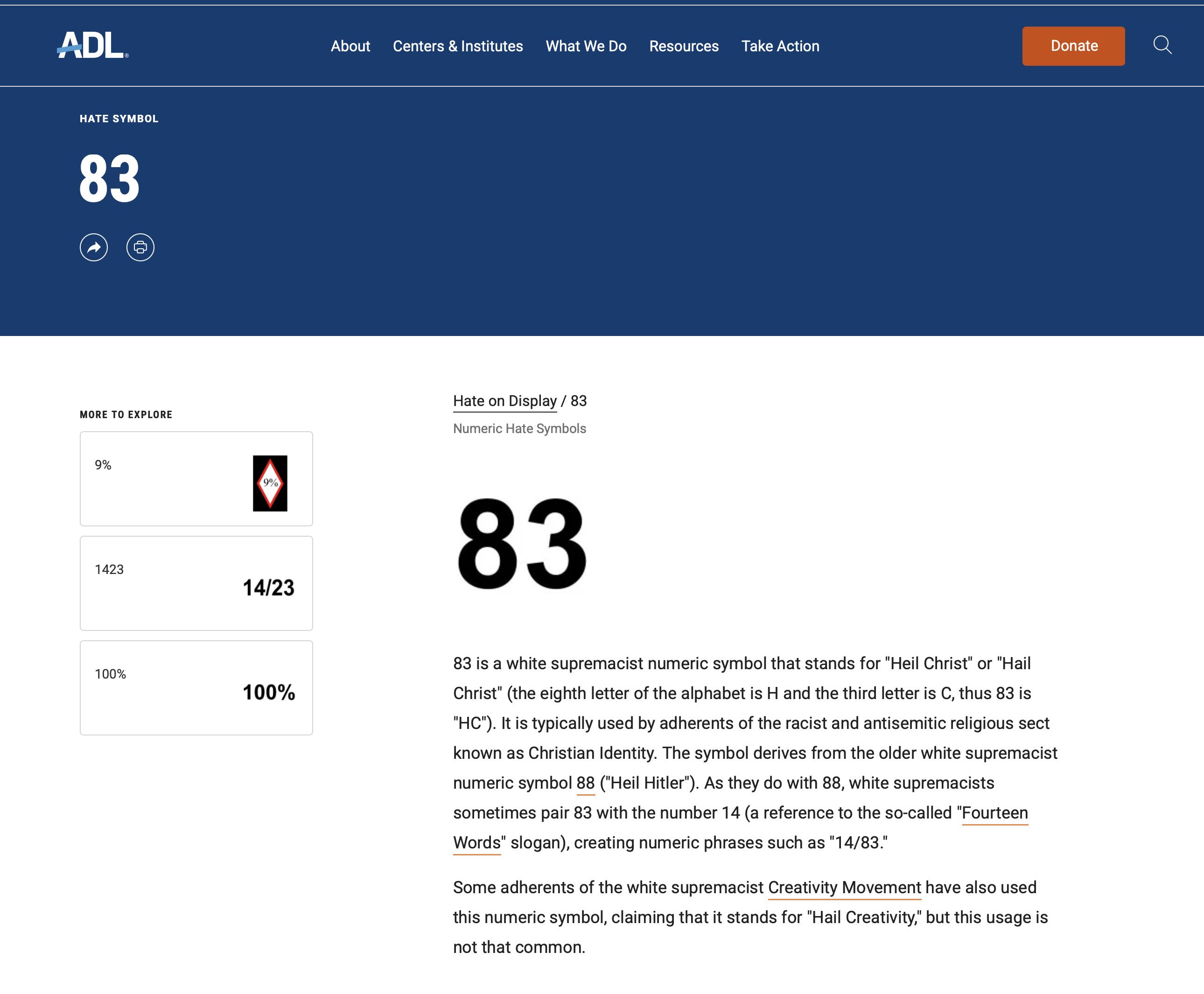 83 is a white supremacist numeric symbol that stands for “Heil Christ” or “Hail Christ” (the eighth letter of the alphabet is H and the third letter is C, thus 83 is “HC”). It is typically used by adherents of the racist and antisemitic religious sect known as Christian Identity. The symbol derives from the older white supremacist numeric symbol 88 (“Heil Hitler”). As they do with 88, white supremacists sometimes pair 83 with the number 14 (a reference to the so-called “Fourteen Words” slogan), creating numeric phrases such as “14/83.”