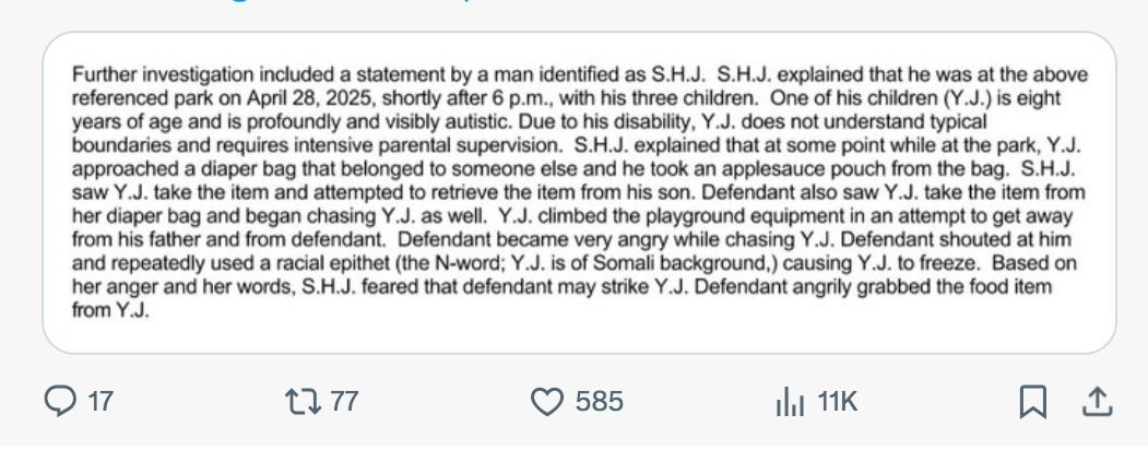 The Rochester City Attorney’s Office moves to leverage three counts of Disorderly Conduct against Shiloh Hendrix, a woman who used slurs against a Somali child with a disability in a since-viral video in April.