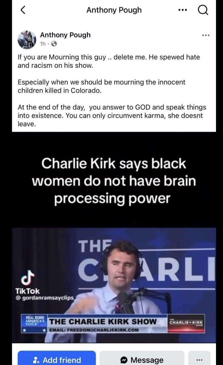 In the Wednesday Facebook post, the Secret Service agent, Anthony Pough, justifies his “karma” comments by making a blanket statement that “Charlie Kirk spews hate and racism on his show and adding the words: “Charlie Kirk says black women do not have the brain processing power.”