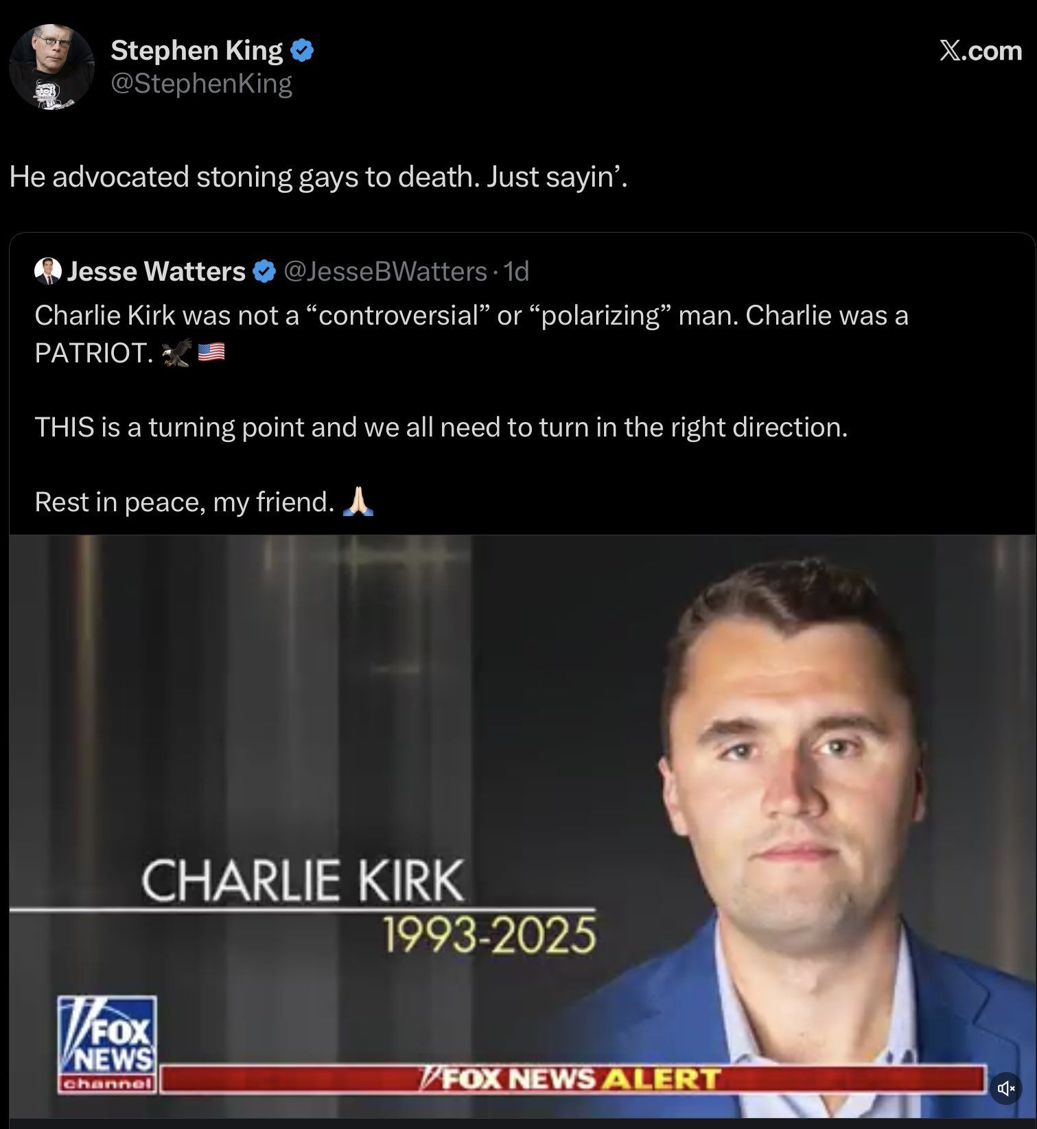 Shortly after Charlie Kirk’s death was confirmed, Stephen King posted on X, seemingly implying that he deserved it.