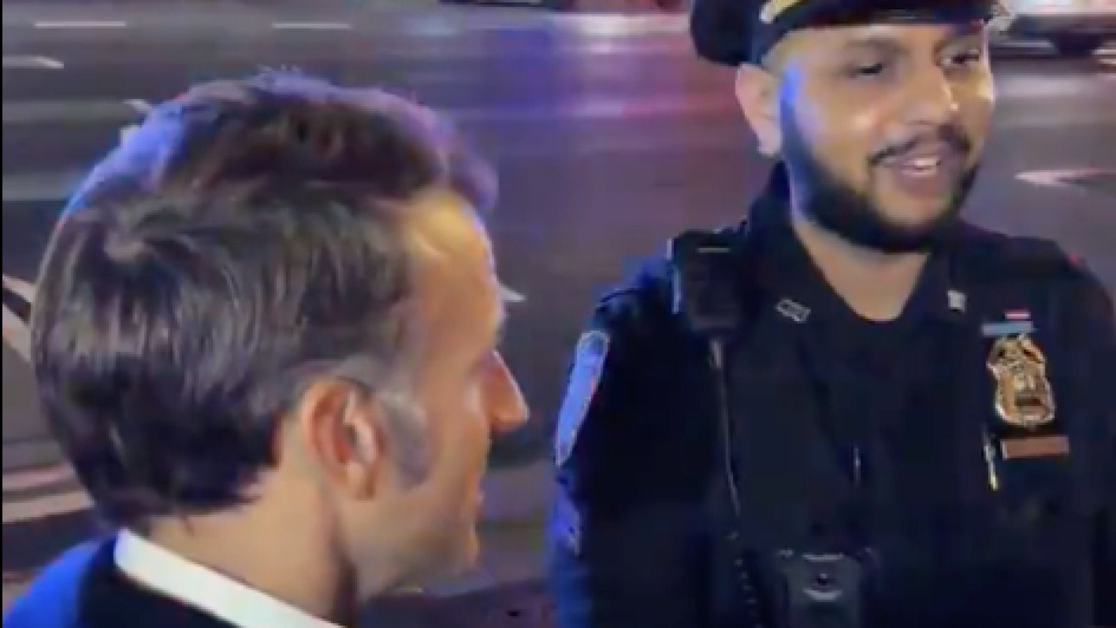 Bizarre video showed the European leader begging an NYPD cop to help him get through on Monday, soon after he finished giving a controversial speech to the United Nations, according to French outlet Brut.
