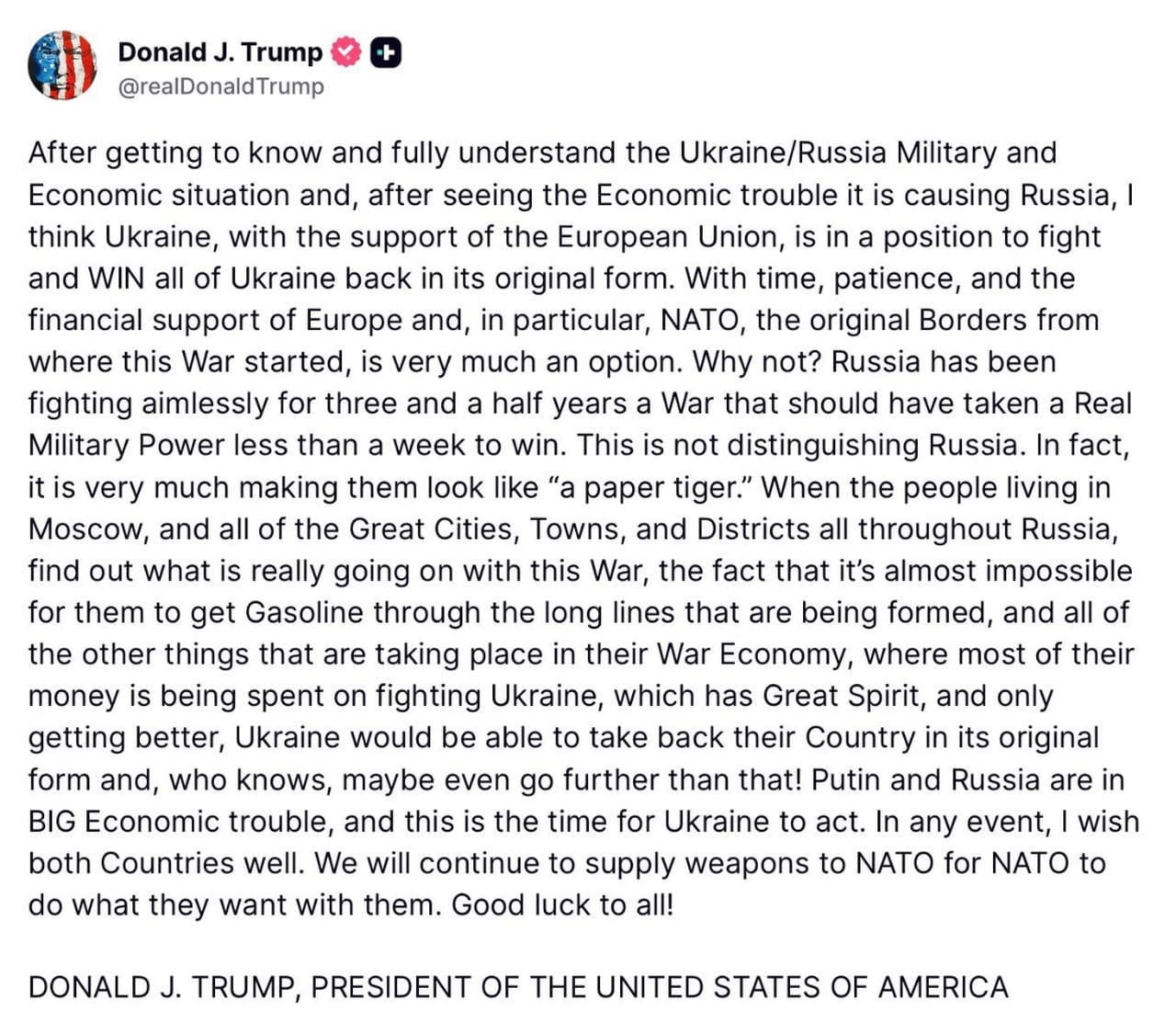 “After getting to know and fully understand the Ukraine/Russia Military and Economic situation and, after seeing the Economic trouble it is causing Russia, I think Ukraine, with the support of the European Union, is in a position to fight and WIN all of Ukraine back in its original form. With time, patience, and the financial support of Europe and, in particular, NATO, the original Borders from where this War started, is very much an option,” Trump said.
