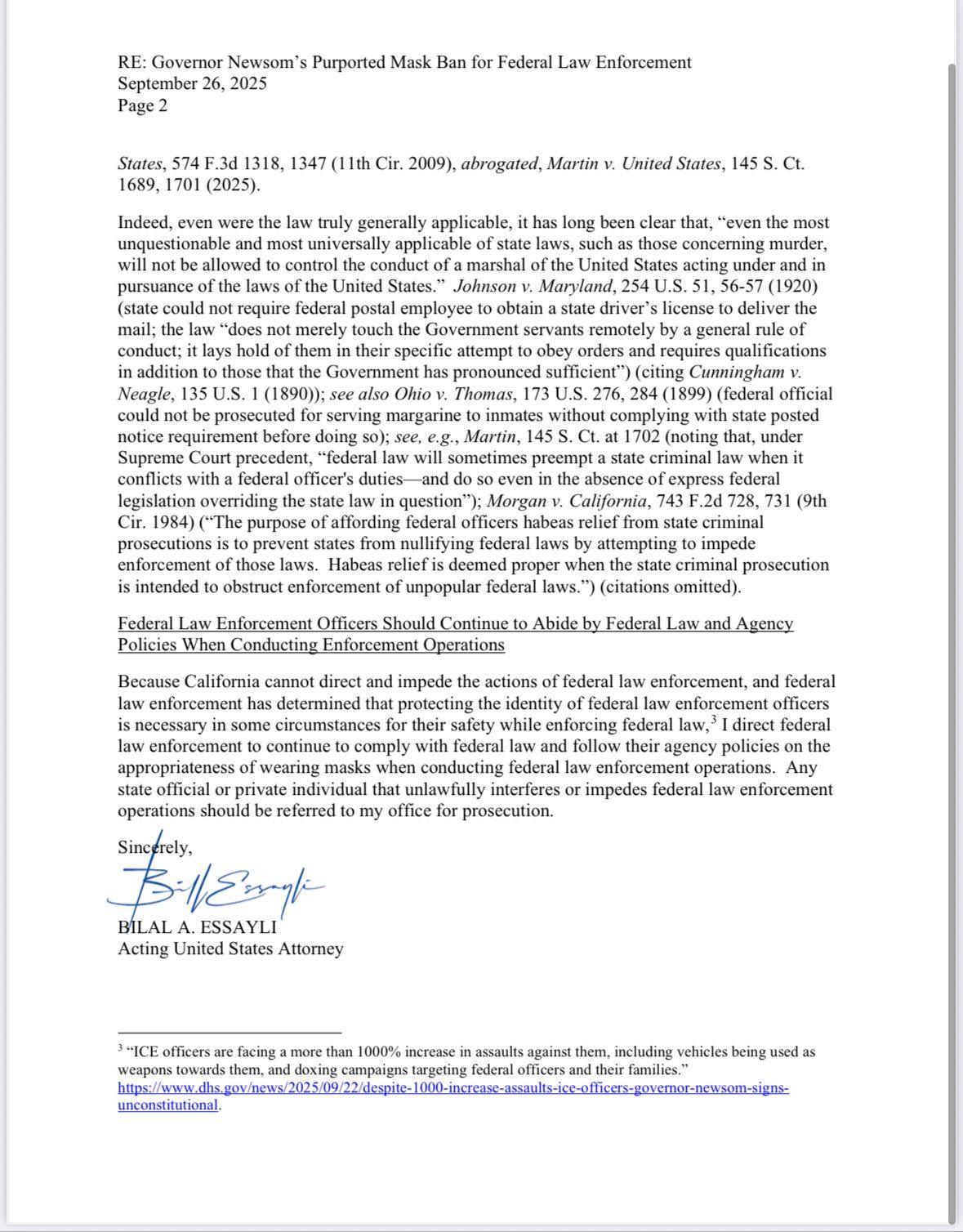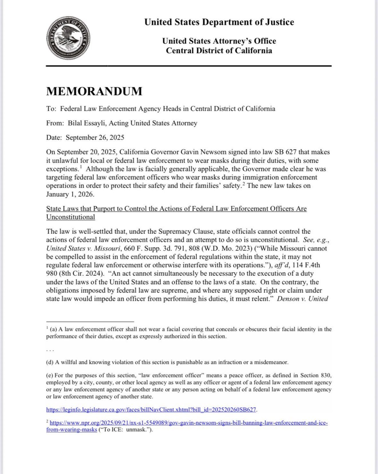 — Acting U.S. Attorney Bill Essayli (@USAttyEssayli) September 26, 2025