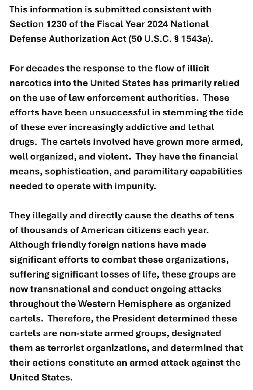 MEMO obtained by @NewsNation @JoeKhalilTV to a select few in Congress lays out that DRUG CARTELS are now “non-state armed groups, terrorist organizations” and the President has determined the U.S. is engaged in “non-international… pic.twitter.com/LDbg8mnn2x