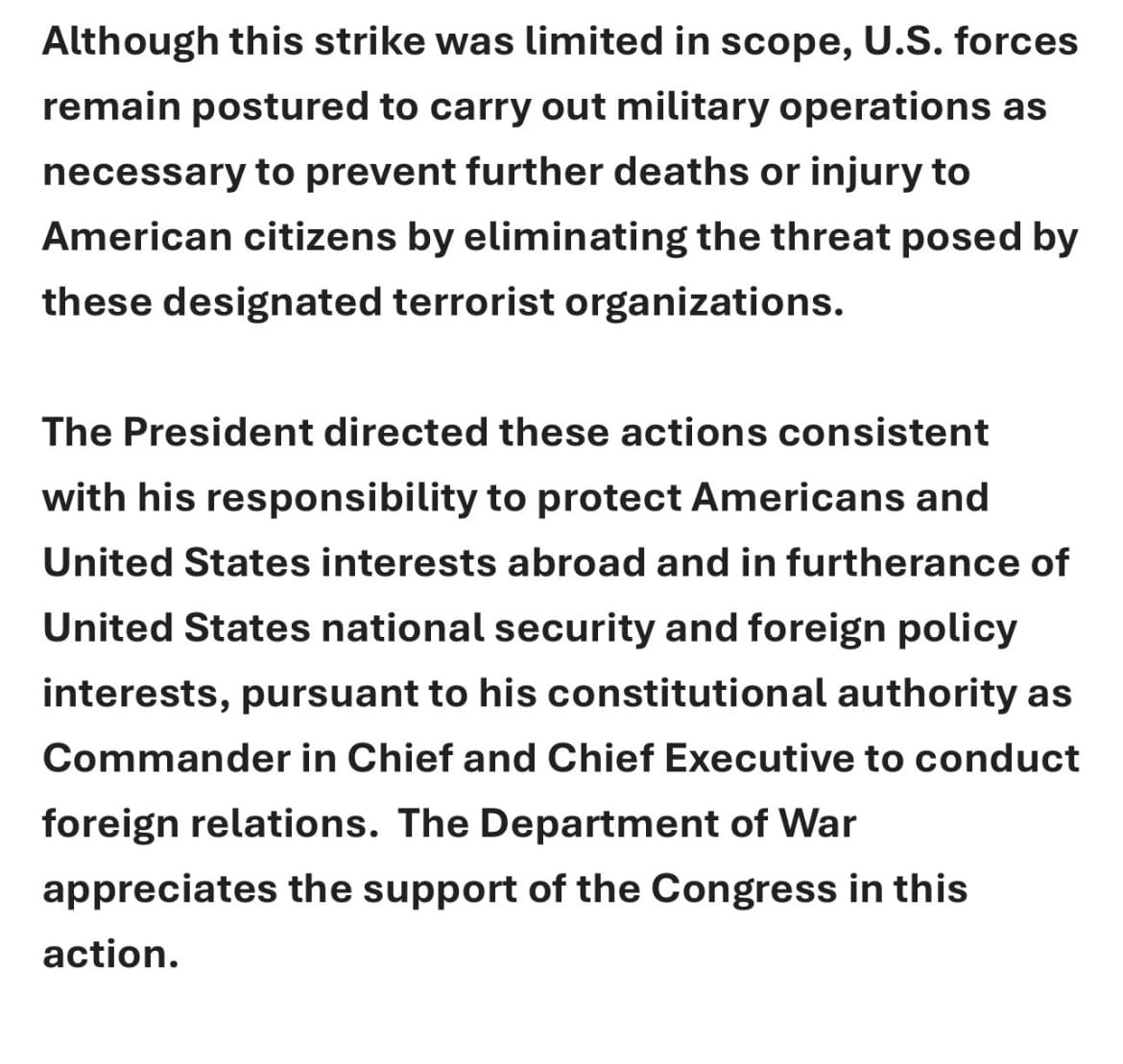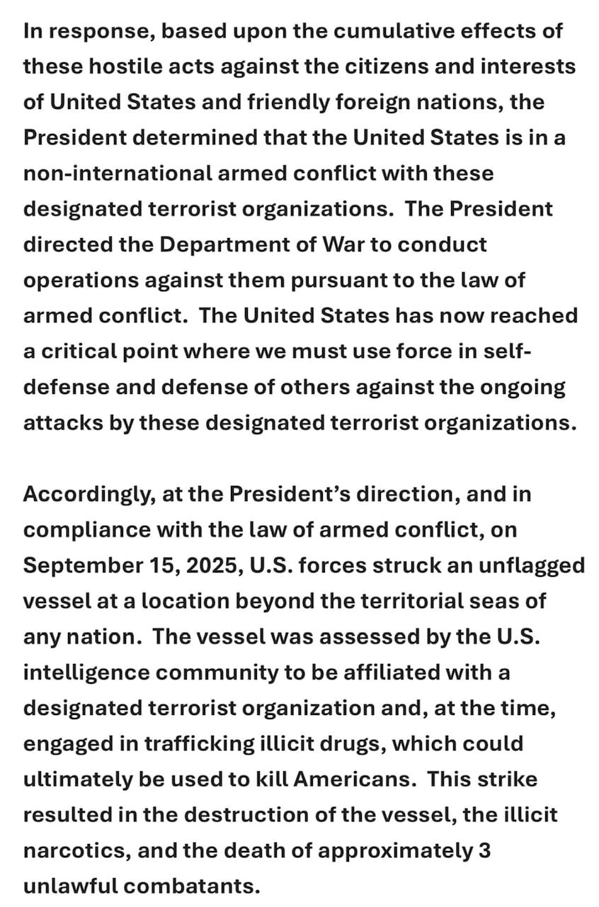 “The President directed the Department of War to conduct operations against them pursuant to the law of armed conflict,” it adds.