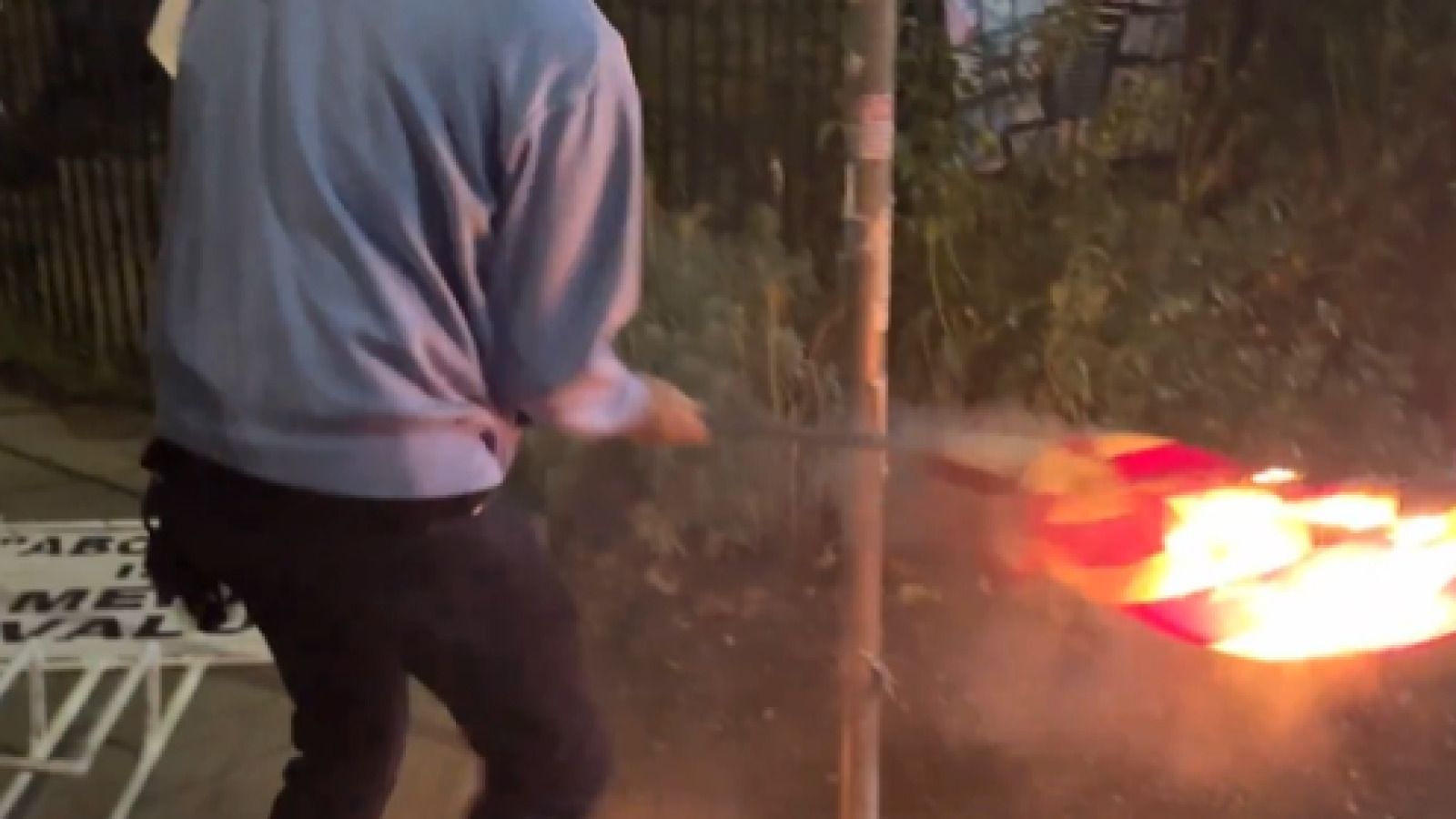 NEW: Last night at the Portland ICE building, we witnessed anti-ICE protesters burning an American flag. @nicksortor then grabbed it from them, put the flames out, and took away what was left of the flag. Nick was arrested later in the night by Portland PD after videos appear to… pic.twitter.com/tQVjEEkLRw