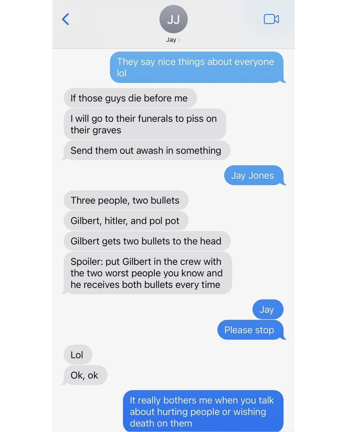 “Three people, two bullets,” read one of the violent texts sent at 8 a.m. on Aug. 8. “Gilbert, hitler, and pol pot.”