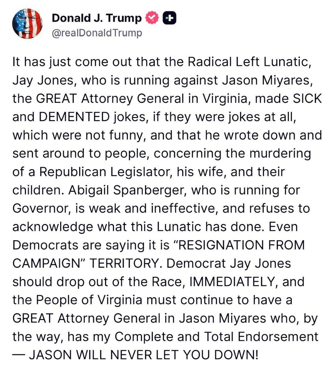 "Abigail Spanberger, who is running for Governor, is weak and ineffective, and refuses to acknowledge what this Lunatic has done. Even Democrats are saying it is 'RESIGNATION FROM CAMPAIGN' TERRITORY. Democrat Jay Jones should drop out of the Race, IMMEDIATELY, and the People of Virginia must continue to have a GREAT Attorney General in Jason Miyares who, by the way, has my Complete and Total Endorsement — JASON WILL NEVER LET YOU DOWN!" he added.