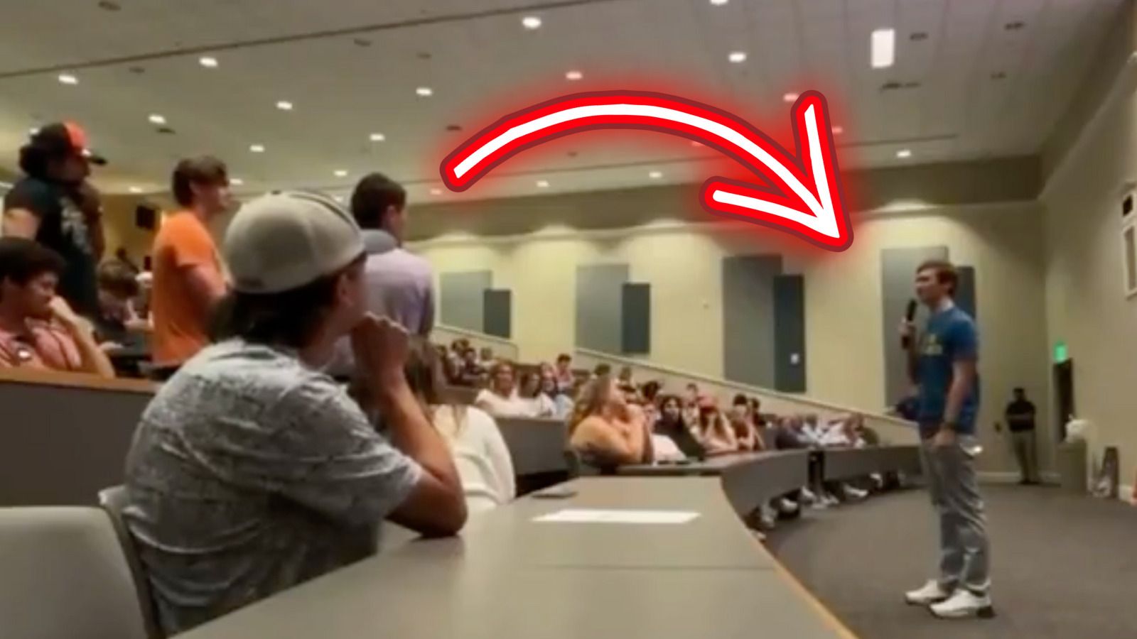 Here he is bragging about a "SOLD-OUT AUDITORIUM" -- except, it just kinda looks like a large classroom and the energy in that room is dead: