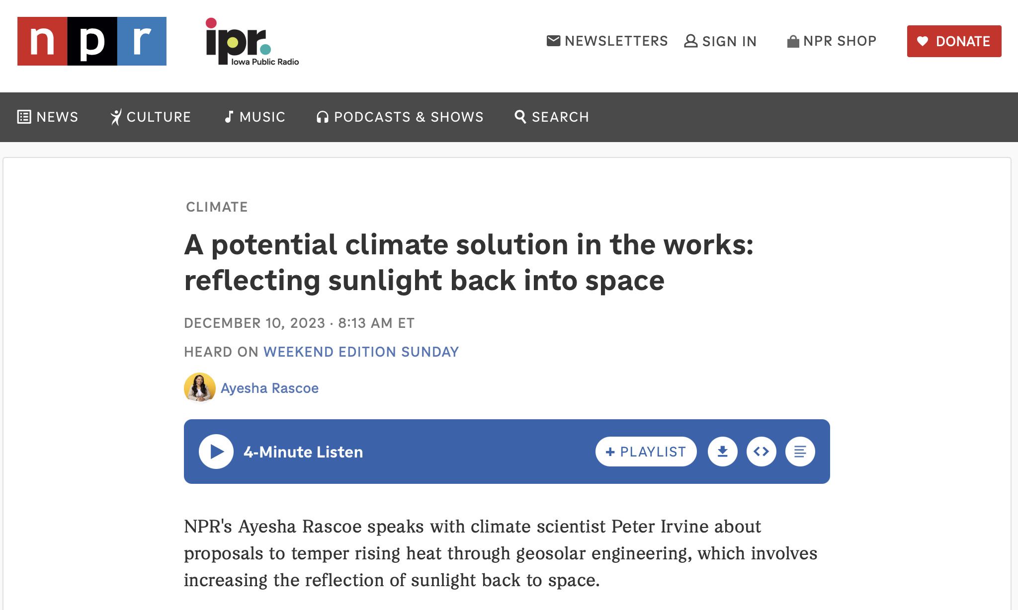 IRVINE: Well, I think the first thing to note is this is not an alternative to cutting greenhouse gas emissions. The CO2 would still be there. It’d still be having this warming effect on the planet. And this would only be a temporary cooling effect to sort of offset some of the consequences.