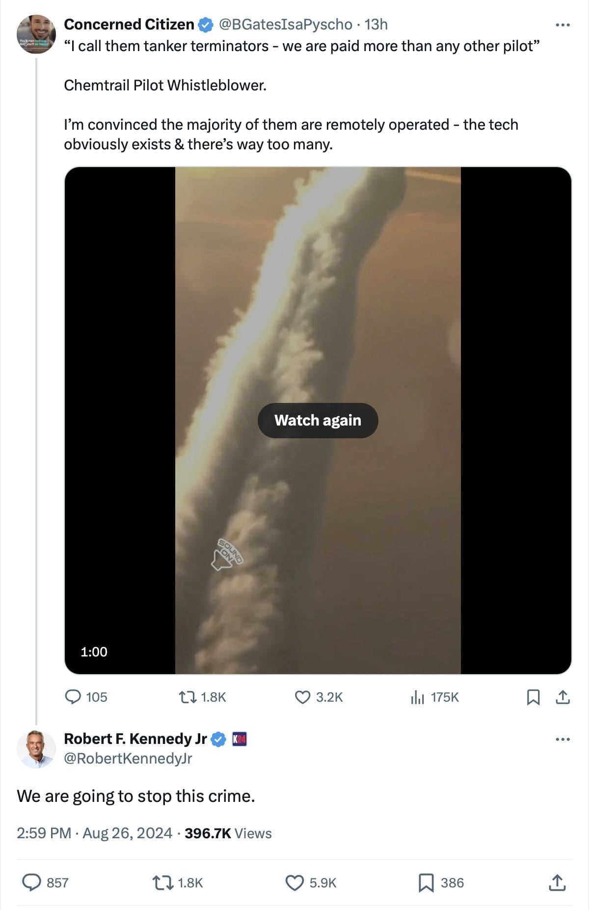 Robert F. Kennedy Jr. Responed to this video by saying “we will stop the crime” of “chemtrails.”