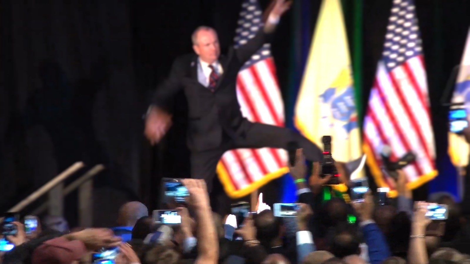 Here’s Phil Murphy in 2017 leaping across the stage following his election victory to become Governor: