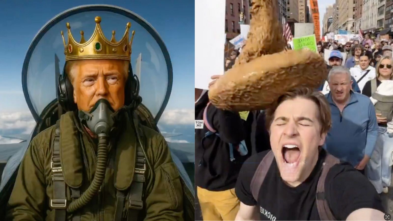 On “No Kings Day” (what a joke), President Trump posted a hilarious clearly-AI video of President Trump in a King’s Crown blasting off in a fighter jet labeled King Trump and then dropping air bombs of liquid diarrhea right on Harry Sisson’s head!