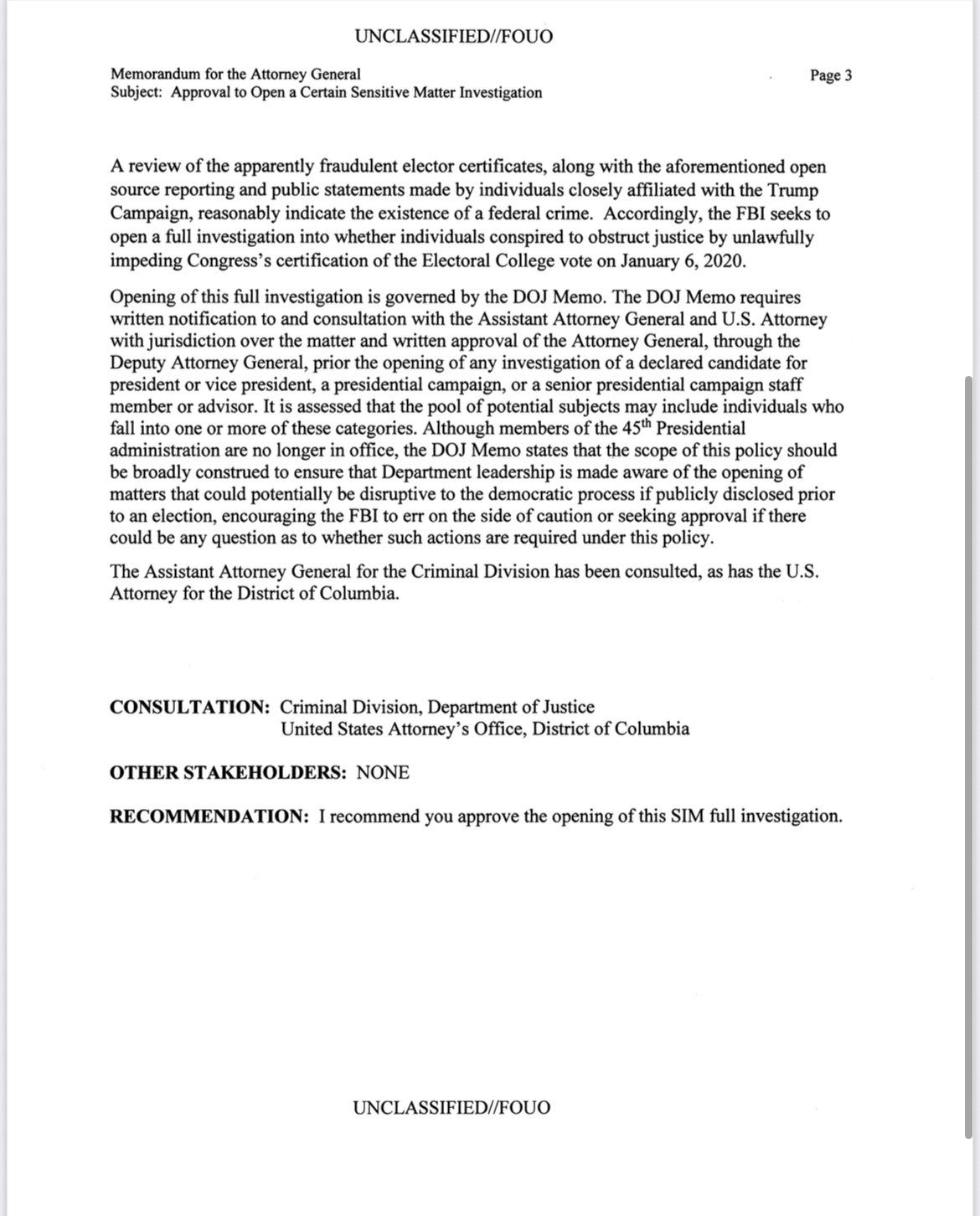 The FBI’s Washington Field Office requested the senior officials’ authorization before looking into “an apparent effort to obstruct Congress’ certification of the Electoral College” and “fraudulent certificates of electors’ votes were submitted to the Archivist of the United States, purporting to represent the actual elector votes from the states of Arizona, Georgia, Michigan, Nevada, and Wisconsin,” the files show.