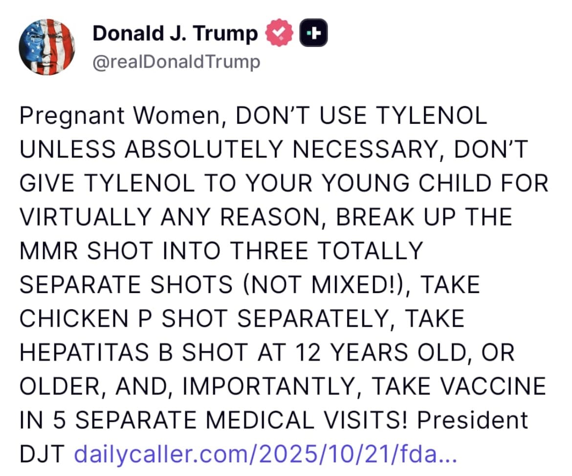 “Pregnant Women, DON’T USE TYLENOL UNLESS ABSOLUTELY NECESSARY, DON’T GIVE TYLENOL TO YOUR YOUNG CHILD FOR VIRTUALLY ANY REASON, BREAK UP THE MMR SHOT INTO THREE TOTALLY SEPARATE SHOTS (NOT MIXED!), TAKE CHICKEN P SHOT SEPARATELY, TAKE HEPATITAS B SHOT AT 12 YEARS OLD, OR OLDER, AND, IMPORTANTLY, TAKE VACCINE IN 5 SEPARATE MEDICAL VISITS! President DJT,” Trump wrote on Truth Social.